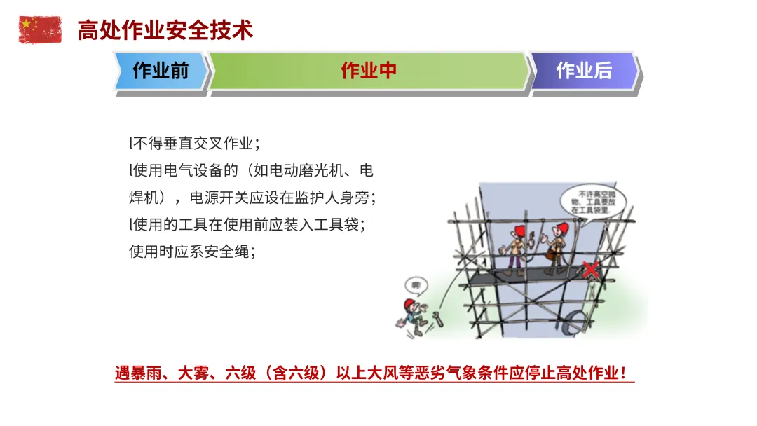 高处作业:佩戴安全帽、安全带,工具装入工具袋;遇暴雨、大雾、六级以上大风停止作业;严禁垂直交叉作业,30米以上作业需配备通讯工具。