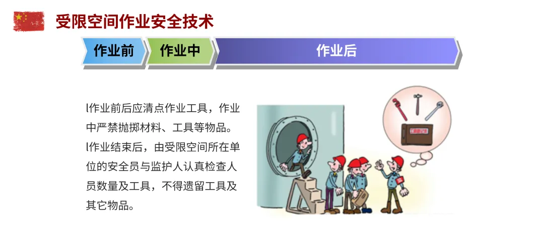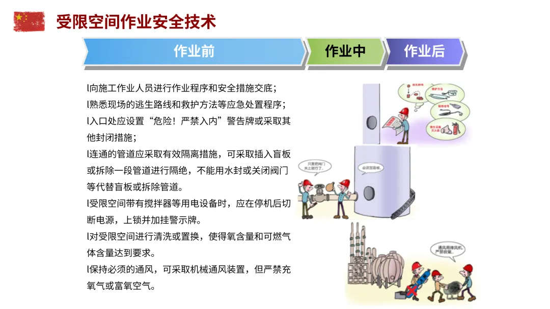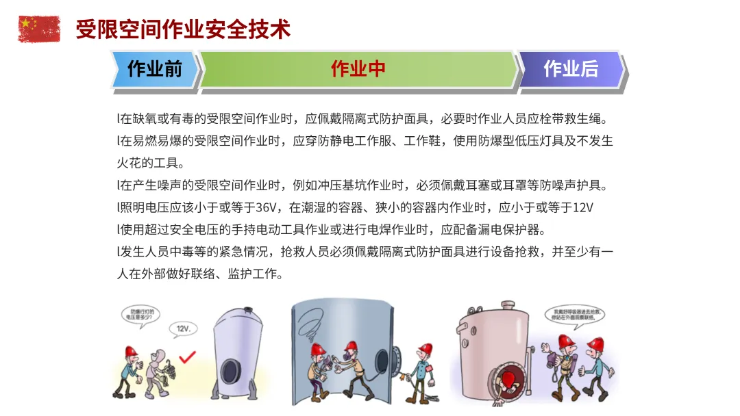 受限空间作业:提前清洗置换,保证通风;佩戴隔离式防护面具,拴带救生绳;照明电压不超过36V,潮湿环境不超过12V;严禁盲目施救。