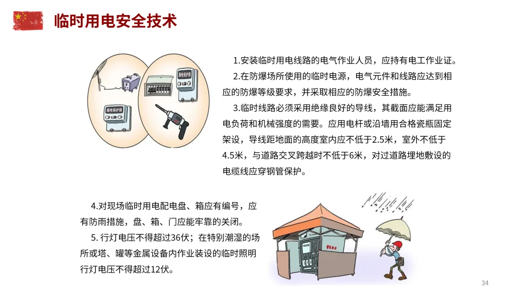 临时用电:由持证电工安装,采用绝缘良好导线;配电盘箱有防雨措施,行灯电压符合安全要求;防爆场所使用对应防爆等级电气元件。