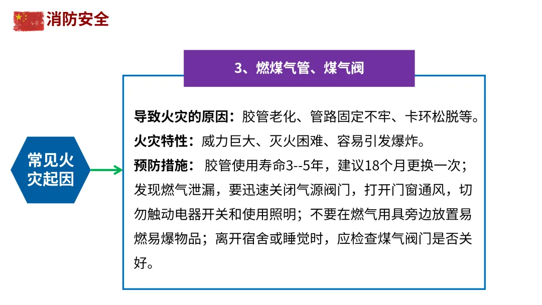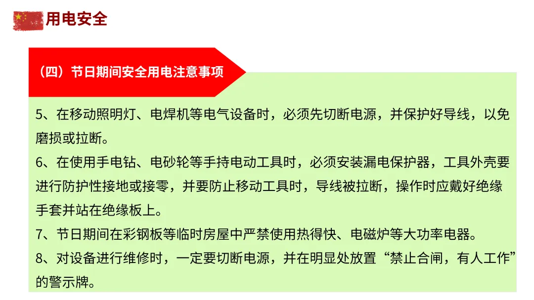 电气安全:不私拉乱接电线,不用铜丝代替保险丝;定期检查线路,老化、破损及时更换;离开时关闭电器电源。