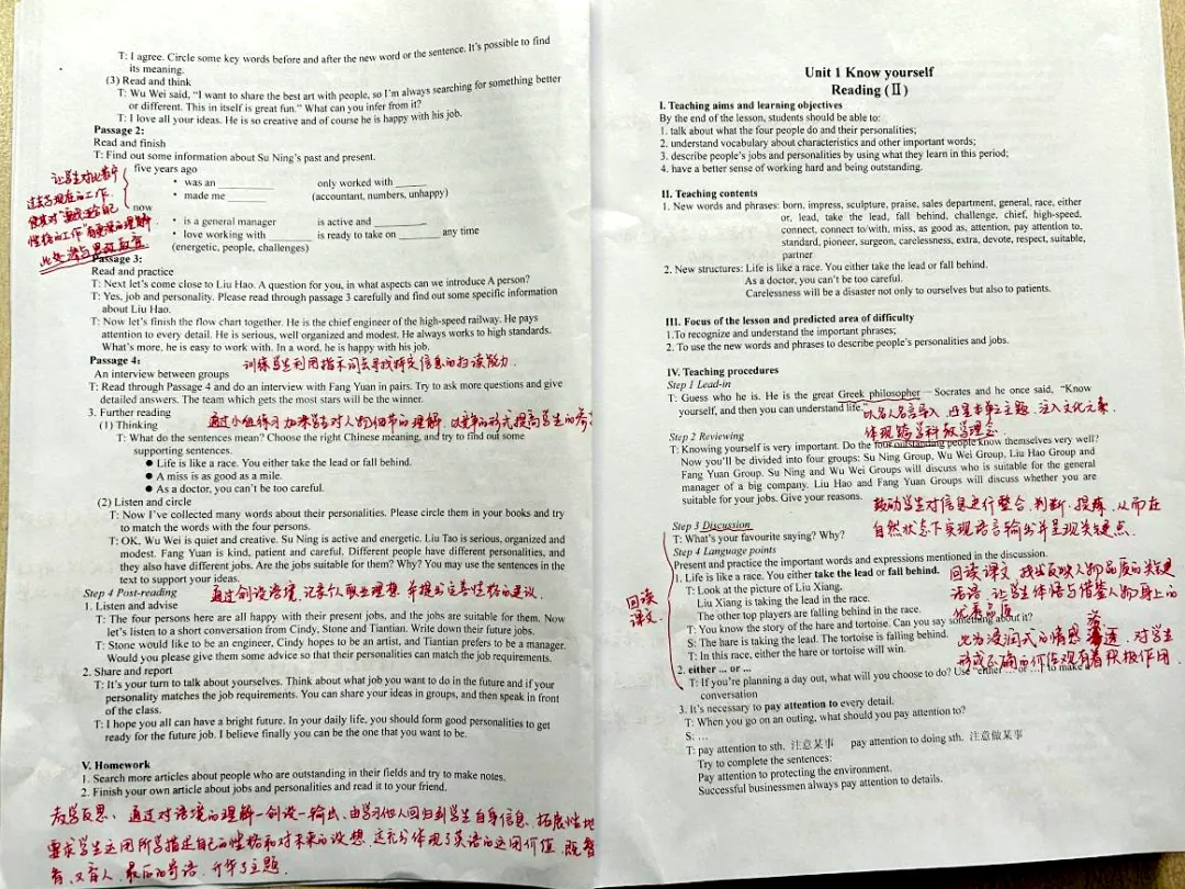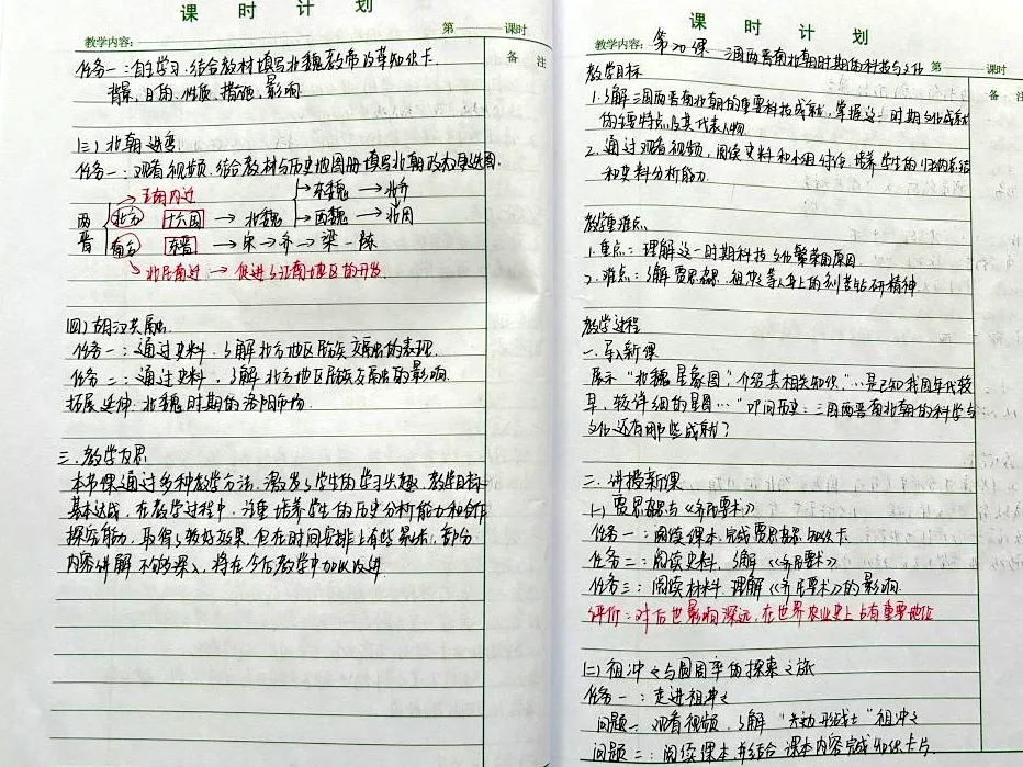 35周岁以上的教师打印教案则均带有明显的二次备课痕迹,通过不同颜色的批注与调整,展现了老师们基于学情与教学实际的深入思考与持续优化。