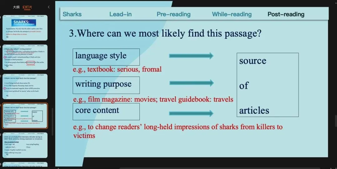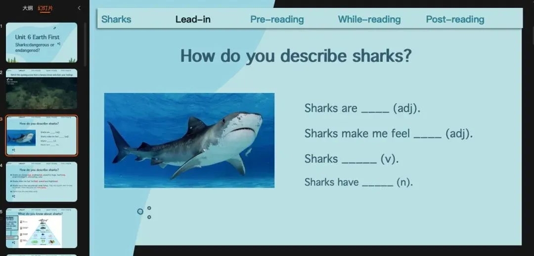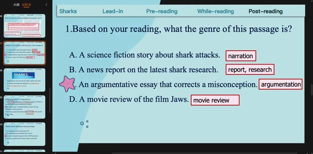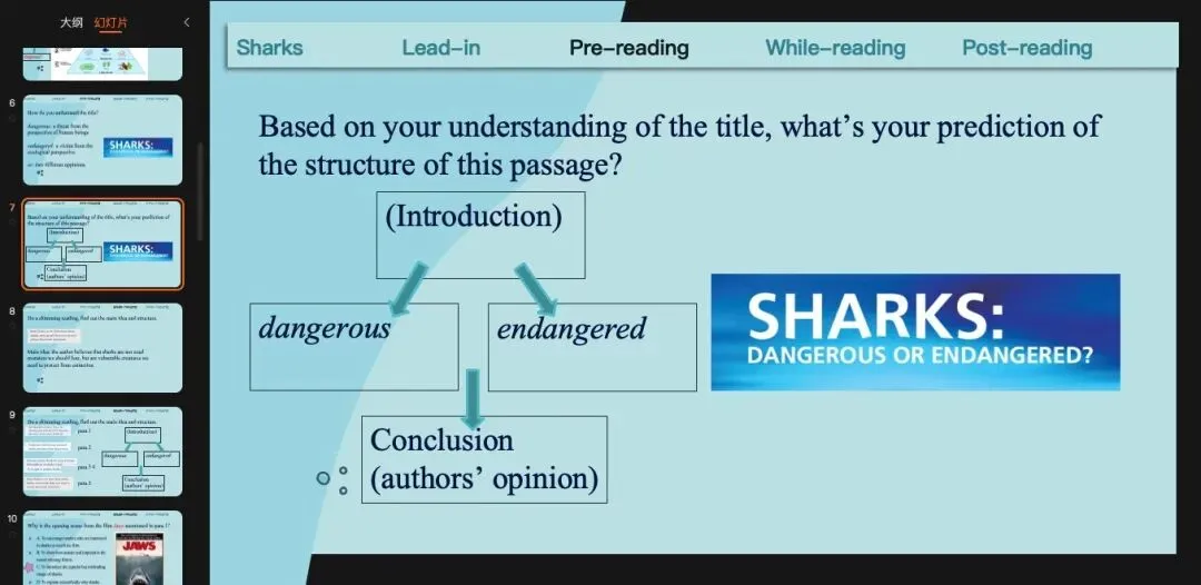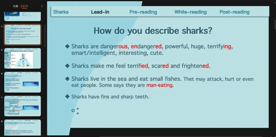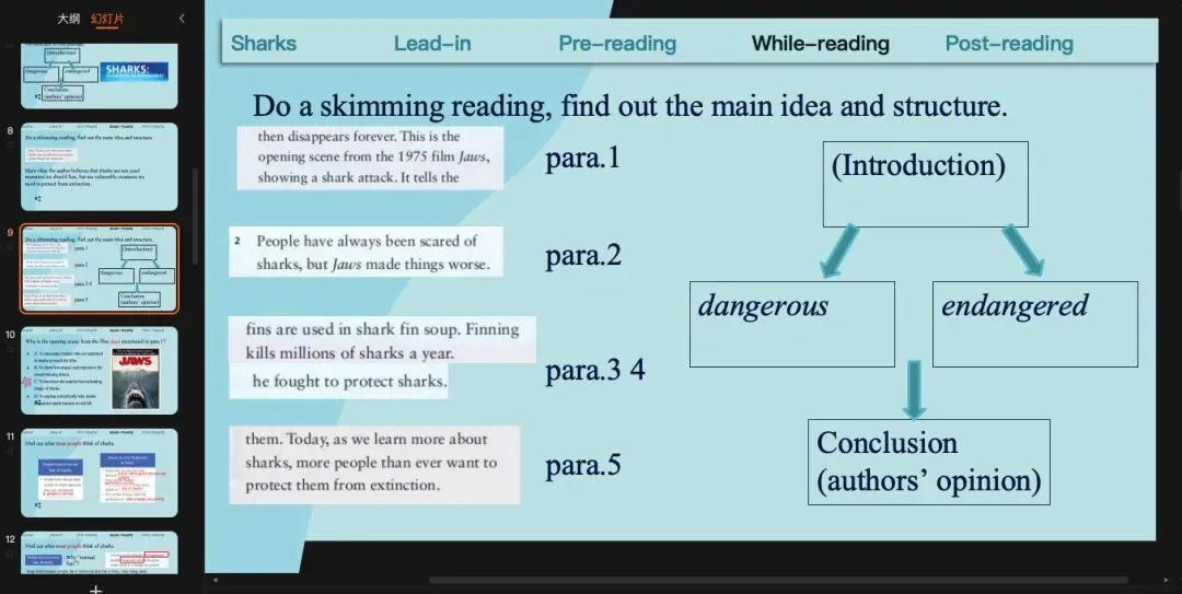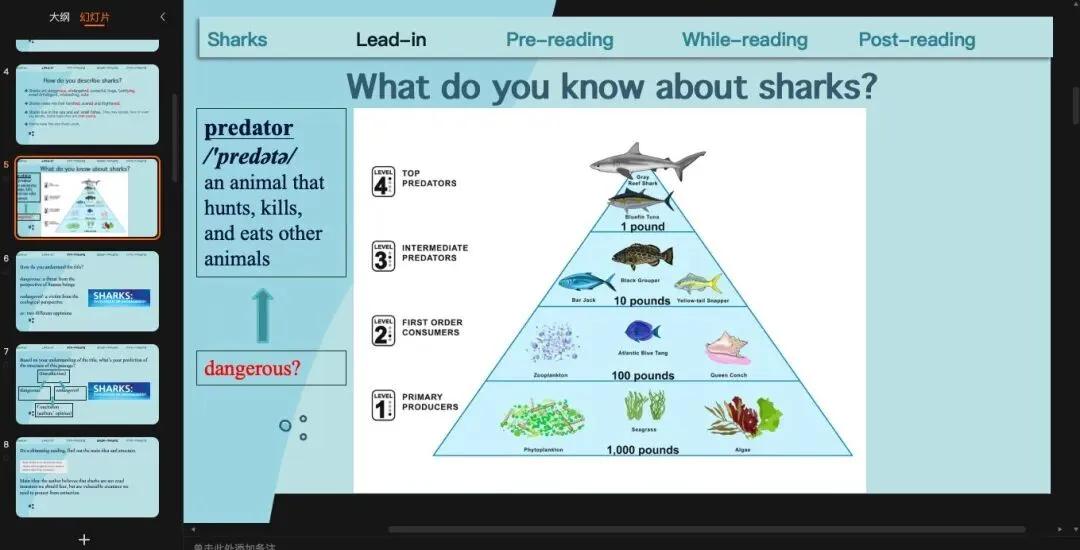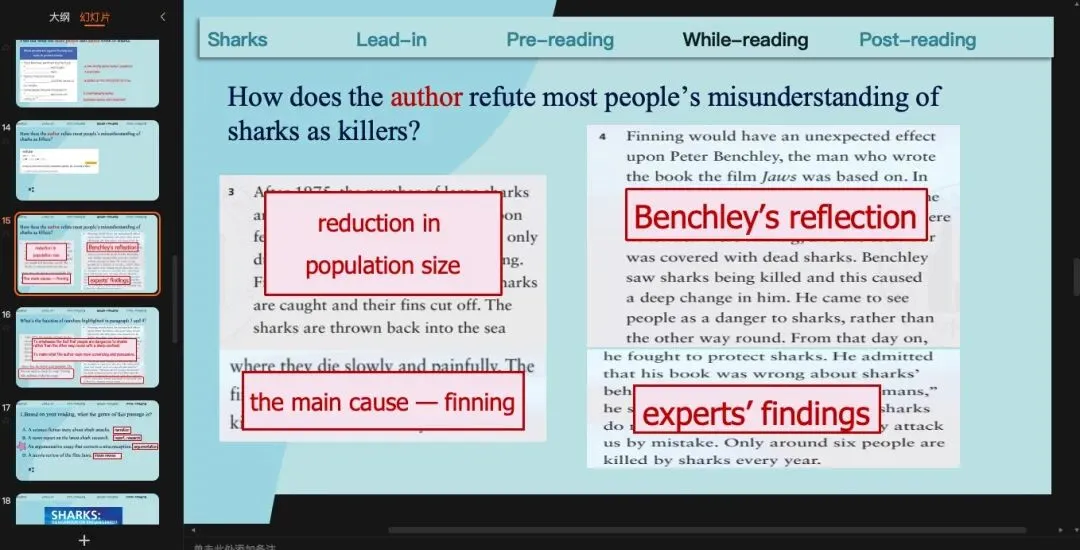 沿用上一个环节的预测,那我们可以读一遍来check我们的预测,也就是main idea(或者是作者自己对于鲨鱼是dangerous还是endangered的看法)和文章结构。这里提一句,就是现在处理文章段意和结构很多老师会用关键词来完成,但是我自己试了之后发现限定用关键词有时候反而比用完整的句子更难。基于我自己学生基础比较差的情况,我一般还是用句子,甚至我会让他们先找原文的句子。(原创ppt)