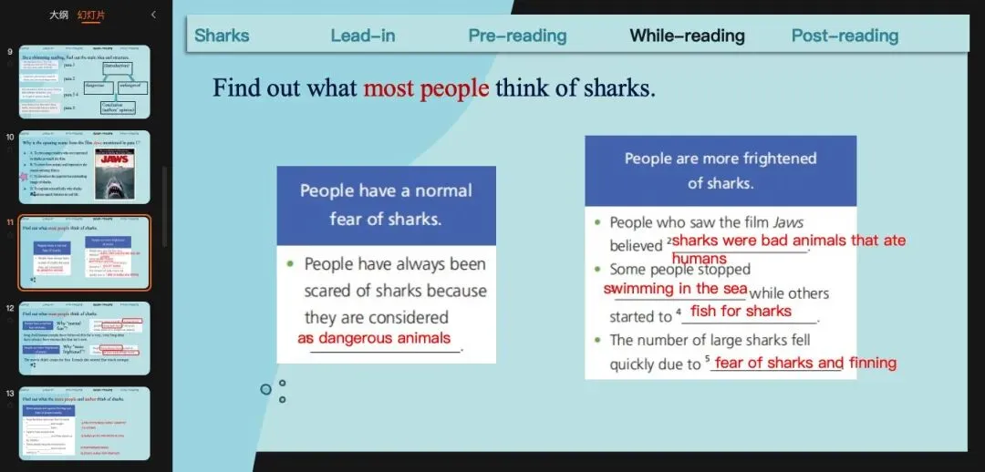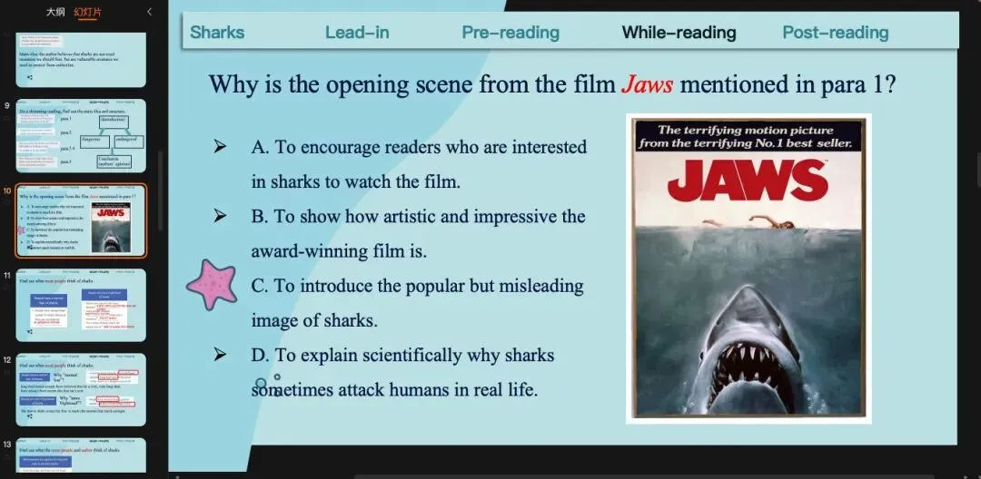 这篇文章还是典型的linear reading,我们从开头一段一段读到最后。整体上我用了教材中的表格题,引导学生用表格的形式完成细节阅读。其次,我针对每一段不同的重点又加了一些读中活动。第一段:引导学生思考为什么用《大白鲨》电影开头作为文章开头?形式:高考难度的选择题。第一、二段:引导学生关注为什么说怕鲨鱼是一种normal fear,哪些语言表达体现了normal这个词;引导学生关注为什么人们更害怕鲨鱼了,这个trigger是什么?第三、四段:引导学生思考作者如何refute前面的sharks as killers的观点,总结驳论的方法;引导学生思考驳论中使用数据的作用,迁移到自己的写作中。(原创ppt)