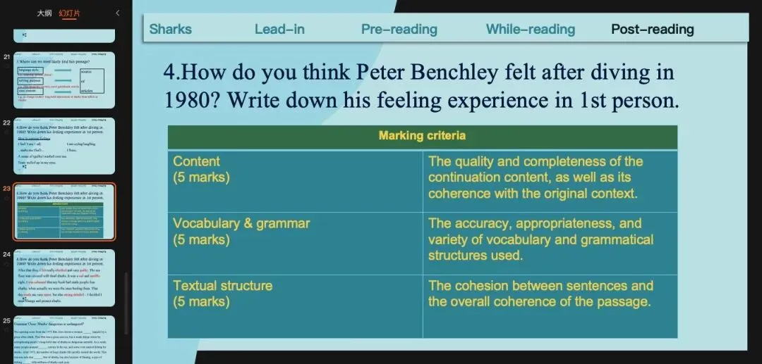 最后为回到教材中的那个讨论活动,让学生假设自己就是 Peter Benchley,写下当时游到海滩看到成群鲨鱼尸体的心理活动。这里也是简单地练习学生记叙文(心理、动作)描写的语言能力。