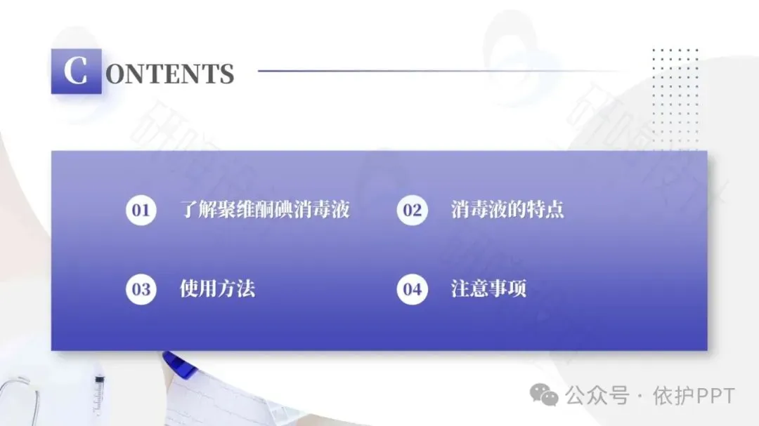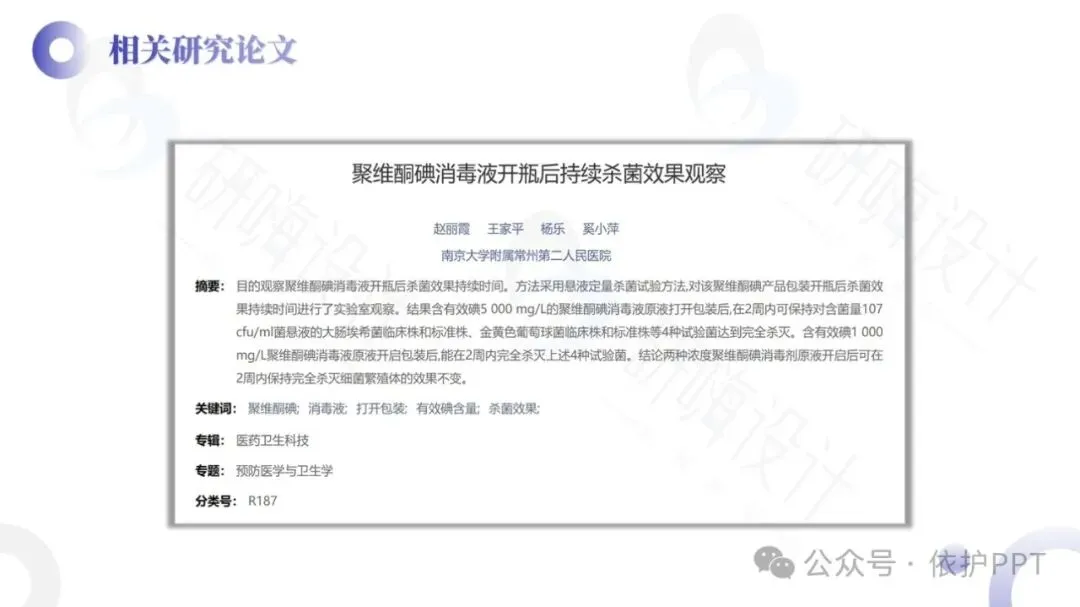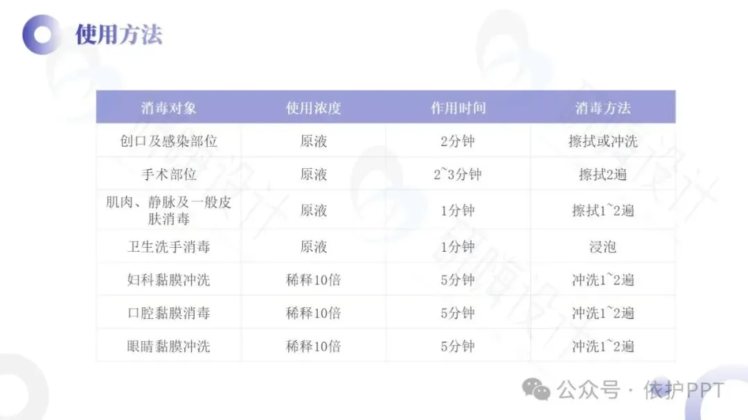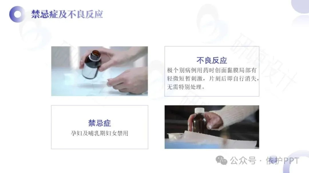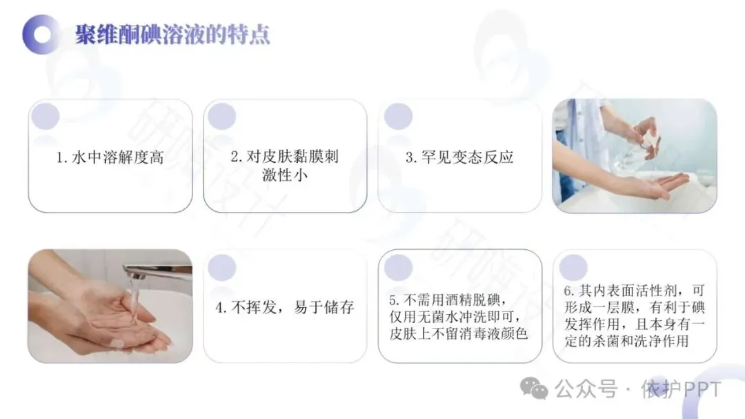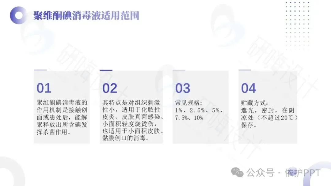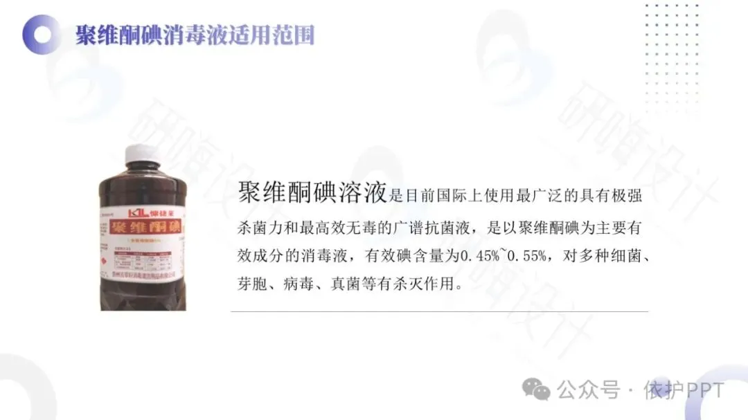 聚维酮碘溶液是目前国际上使用最广泛的具有极强杀菌力和最高效无毒的广谱抗菌液,是以聚维酮碘为主要有效成分的消毒液,有效碘含量为0.45%~0.55%,对多种细菌、芽胞、病毒、真菌等有杀灭作用。聚维酮碘消毒液的作用机制是接触创面或患处后,能解聚释放出所含碘发挥杀菌作用。其特点是对组织刺激性小,适用于化脓性皮炎、皮肤真菌感染、小面积轻度烧烫伤,也适用于小面积皮肤、黏膜创口的消毒。
