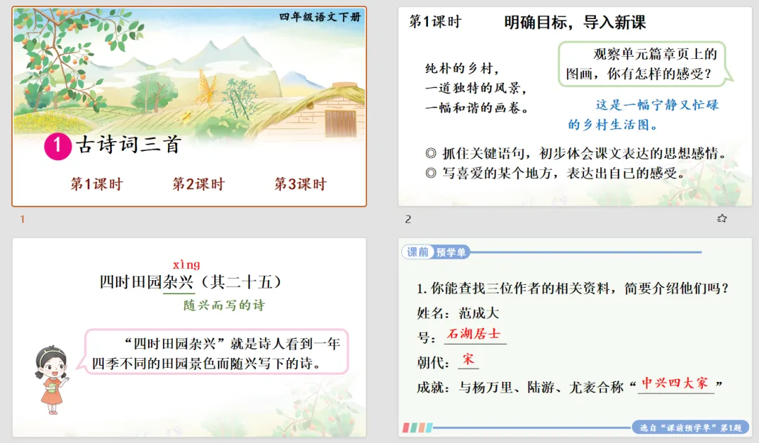 【语文教案课件】部编版小学语文四年级下册表格配套教案课件(含反思)《第1课 古诗词三首》