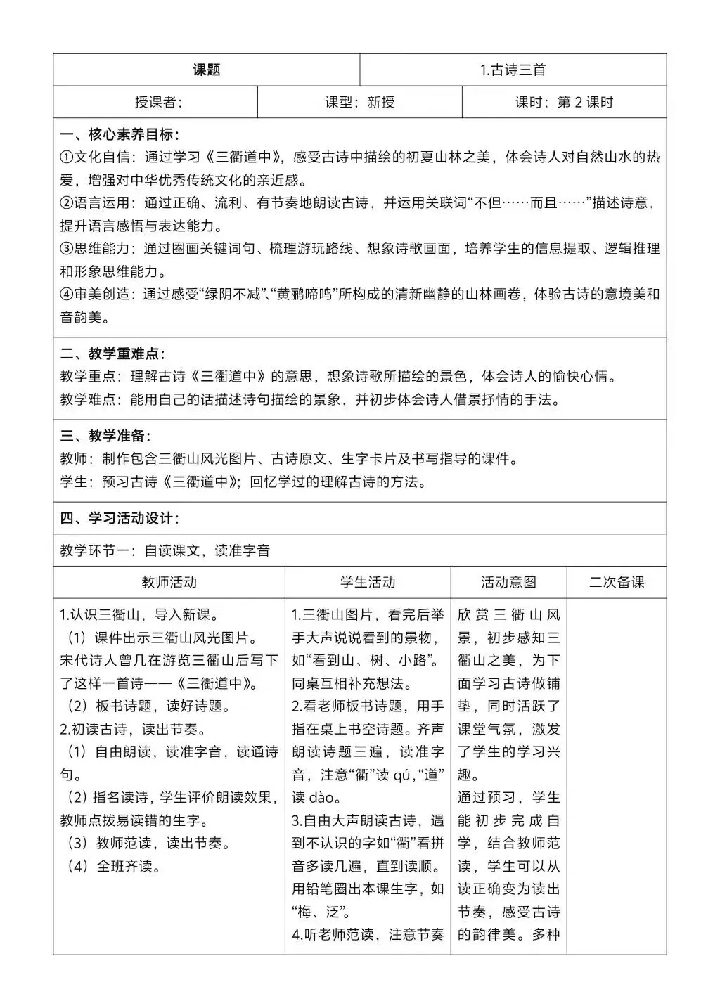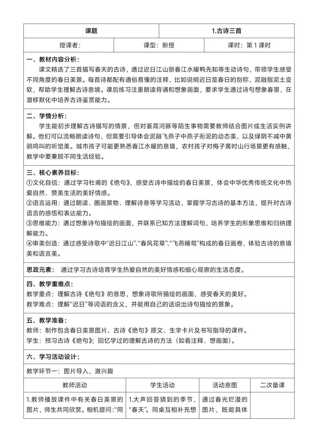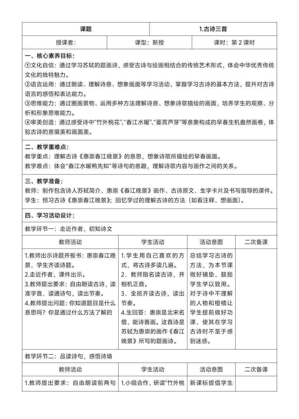 【语文教案课件】部编版小学语文四年级下册表格配套教案课件(含反思)《第1课 古诗词三首》