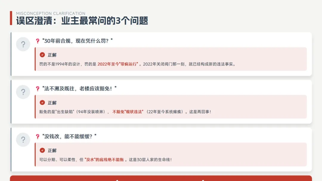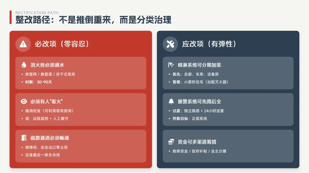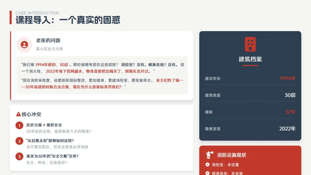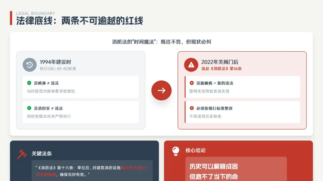 A: 背景高层建筑:94年建设;当时因为历史原因未设置消控室和喷淋,22年地下管网漏水整个消防管网关闭,消防栓也没用水。 那对于这种特例高层来说~~相应的检查,我们还是按照现在的标准去处置吗?