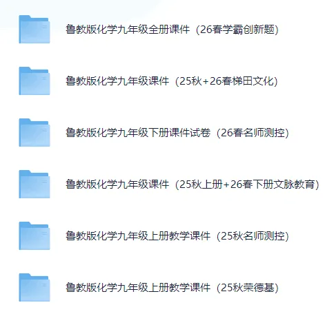 26春鲁教版化学九年级上下册教学资源包里有课件、练习题、教学计划总结、作业课件等;因版面有限,这里只展示下册部分课件,全部电子版资料用本文末的方法可以下载。