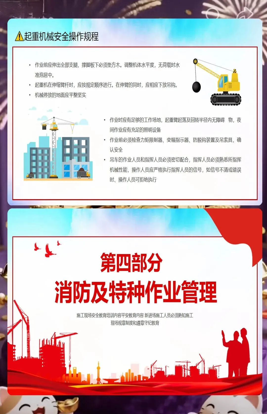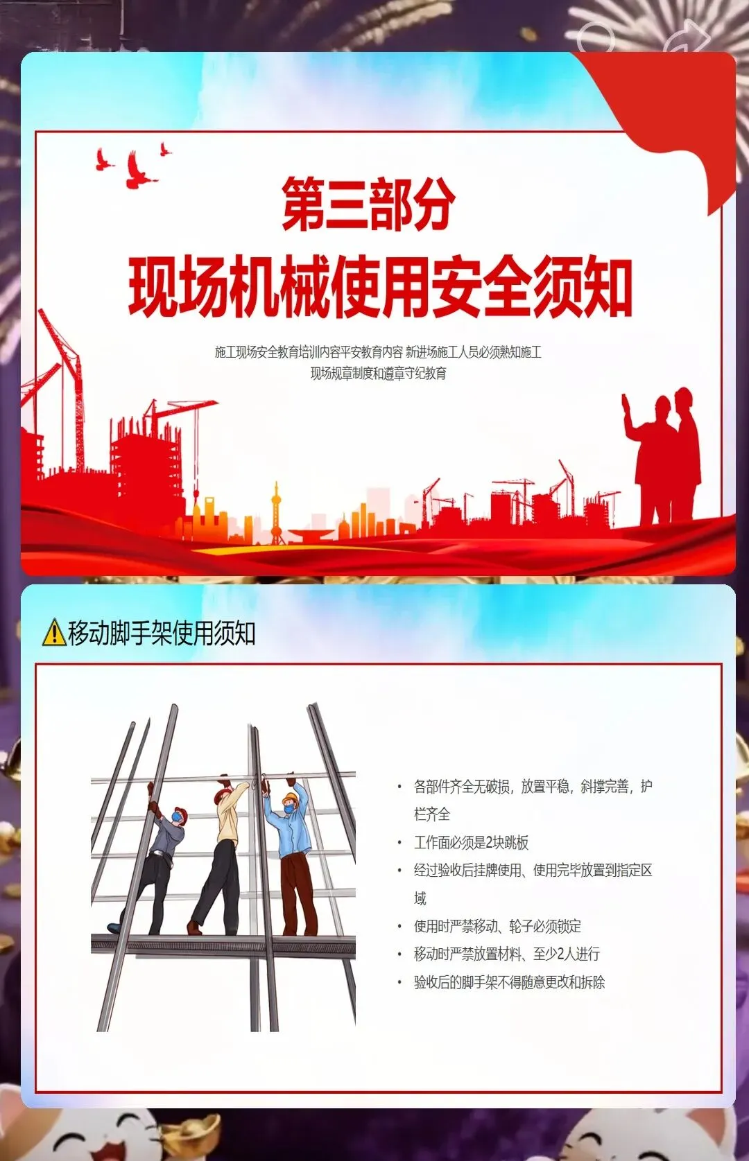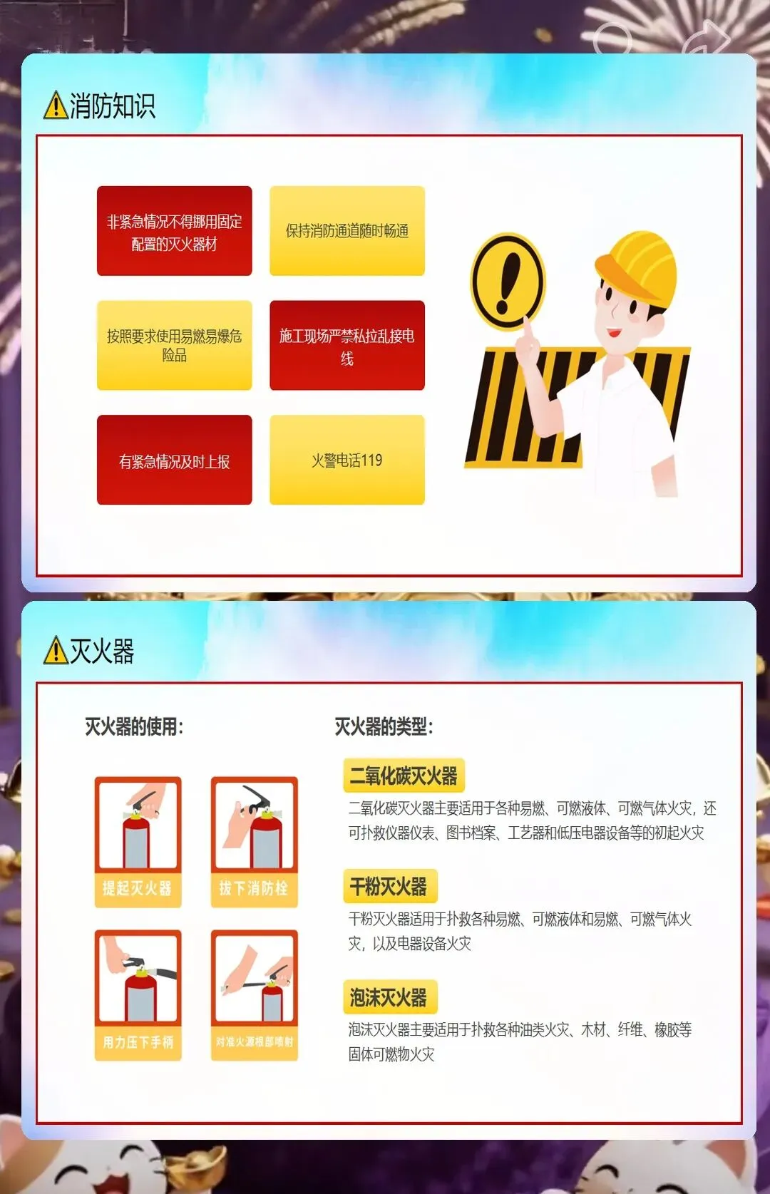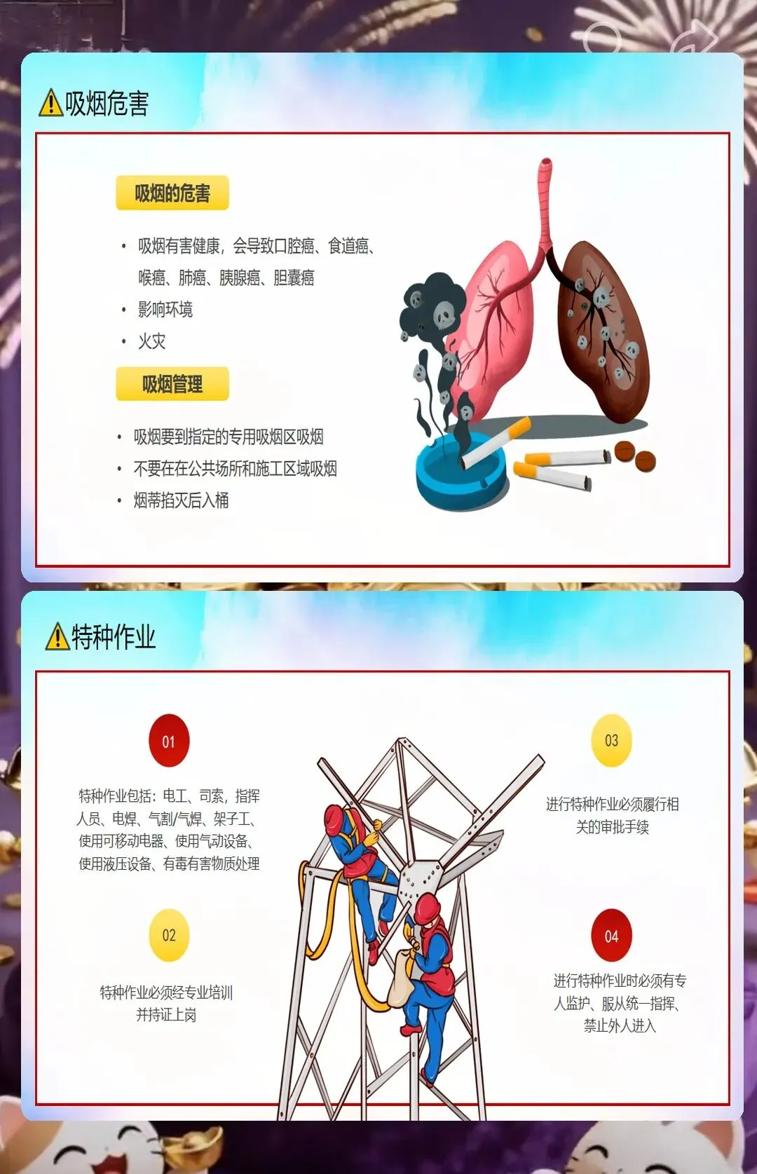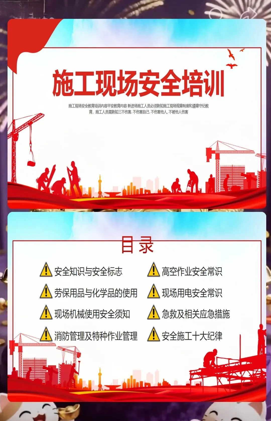 还有防火安全,小型工地里木板、油漆、胶水这些易燃材料多,随便扔烟头、违规动火都容易引发火灾。课件里告诉工人,施工现场不能抽烟,动火要申请动火证,旁边还要放灭火器。之前有个装修工地的工人在现场抽烟,把烟头扔在木板堆里,差点引发火灾,后来用了我们的课件做培训,工人们再也不在现场抽烟了,每次动火都会提前申请。
