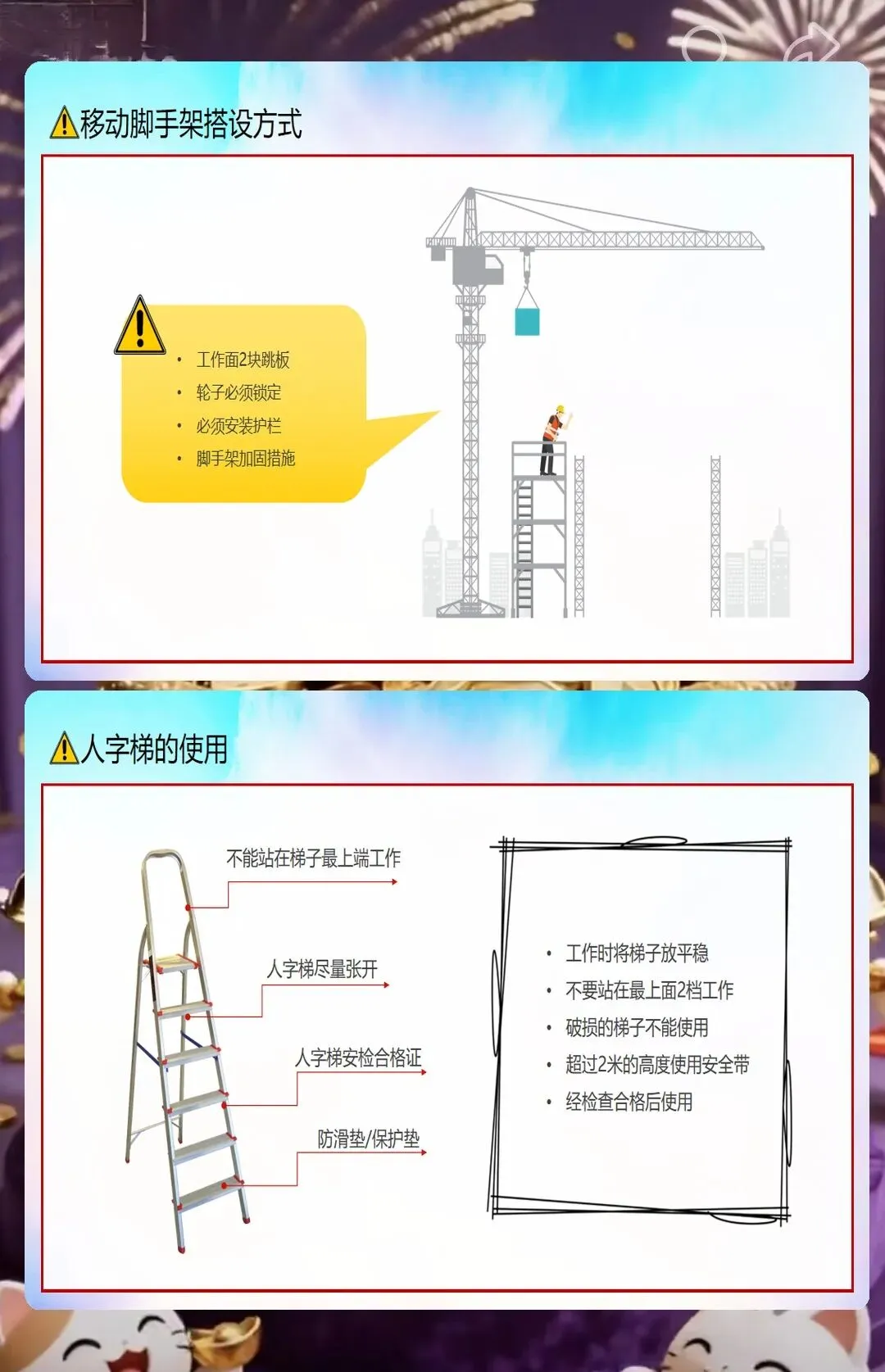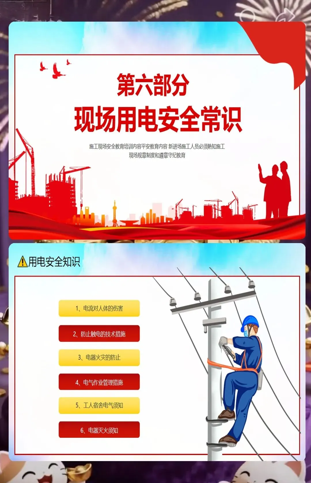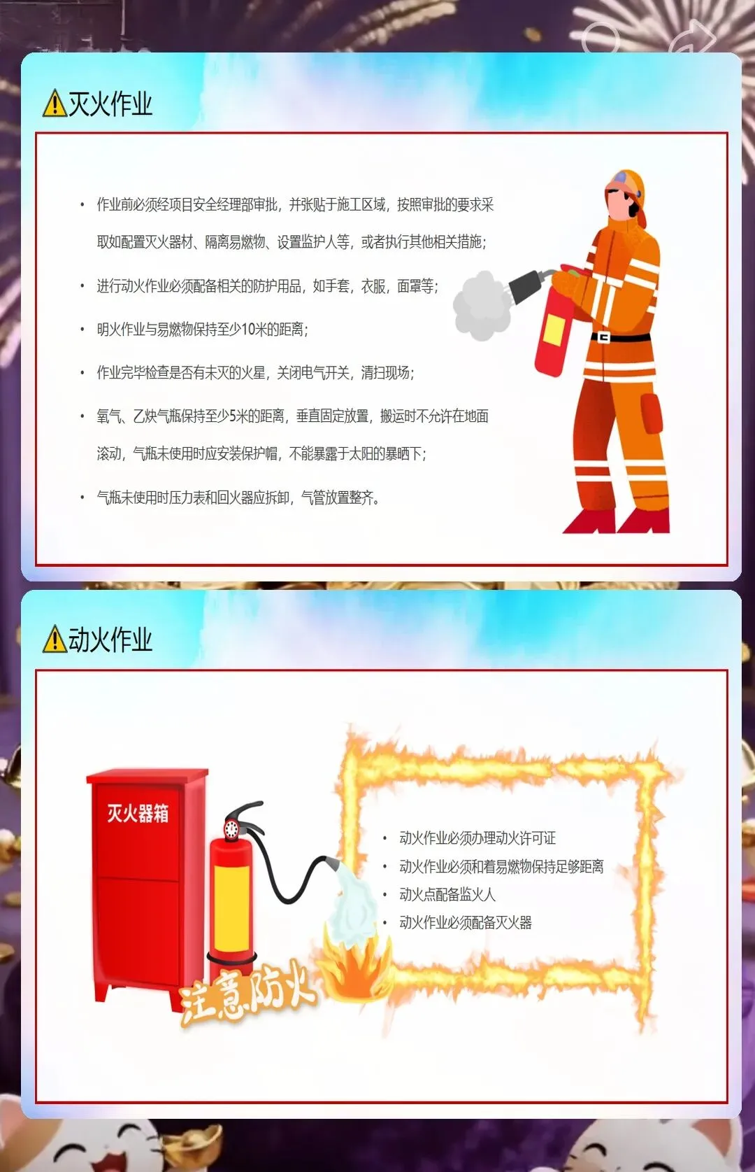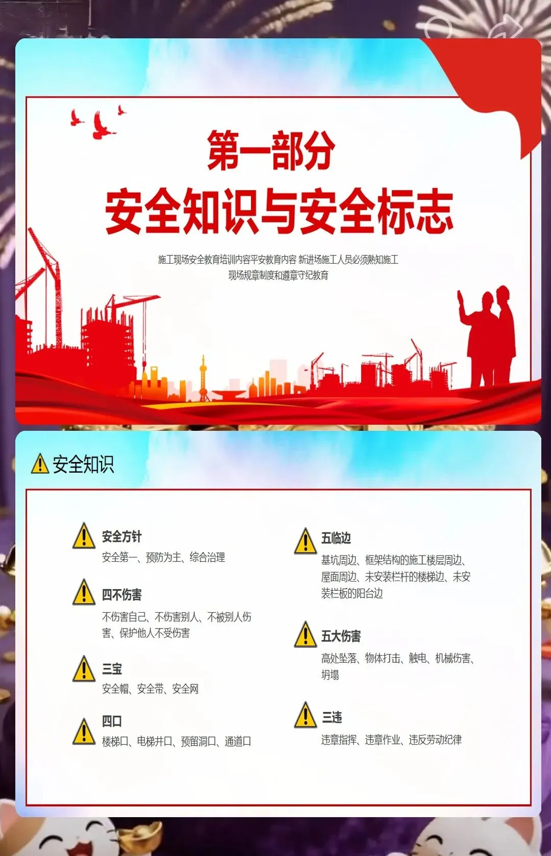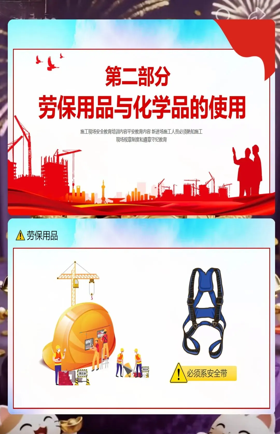 还有防火安全,小型工地里木板、油漆、胶水这些易燃材料多,随便扔烟头、违规动火都容易引发火灾。课件里告诉工人,施工现场不能抽烟,动火要申请动火证,旁边还要放灭火器。之前有个装修工地的工人在现场抽烟,把烟头扔在木板堆里,差点引发火灾,后来用了我们的课件做培训,工人们再也不在现场抽烟了,每次动火都会提前申请。