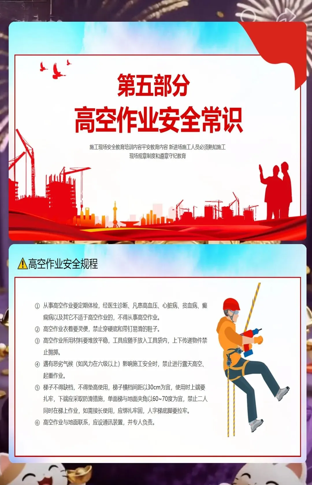 开工第一课不是走形式,是给工人们敲警钟,让大家刚开工就把安全记在心上。课件里还有很多实用的小技巧,比如高空作业时工具要放在工具袋里,不能随便扔下来;搬运重物时要弯腰用腿发力,不能用腰发力,不然容易闪腰;遇到恶劣天气要停止作业,不能硬着头皮干。
