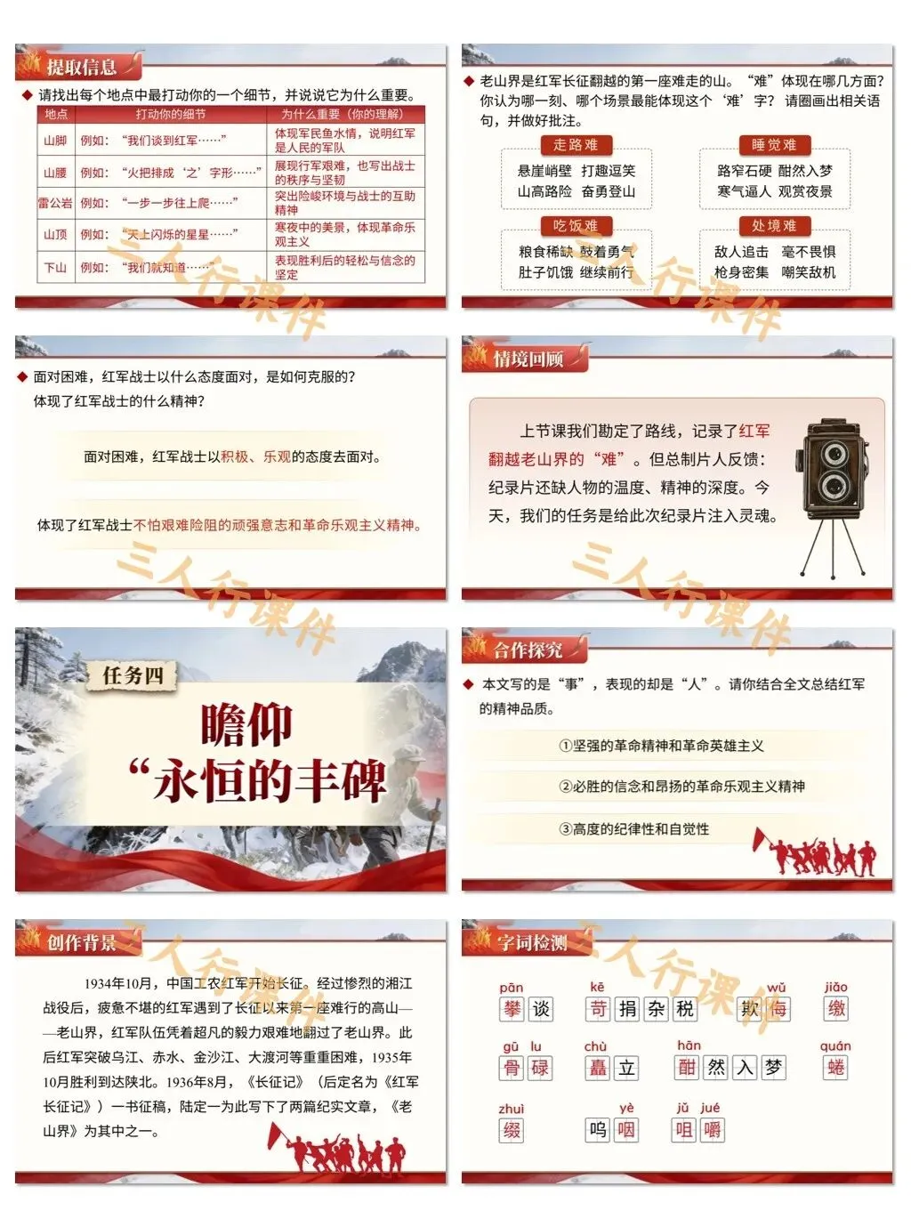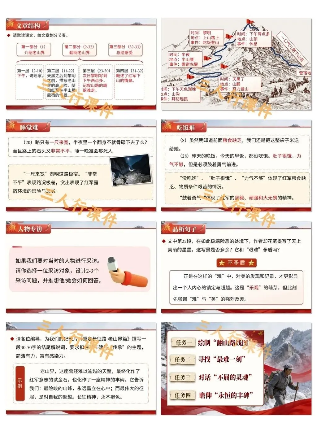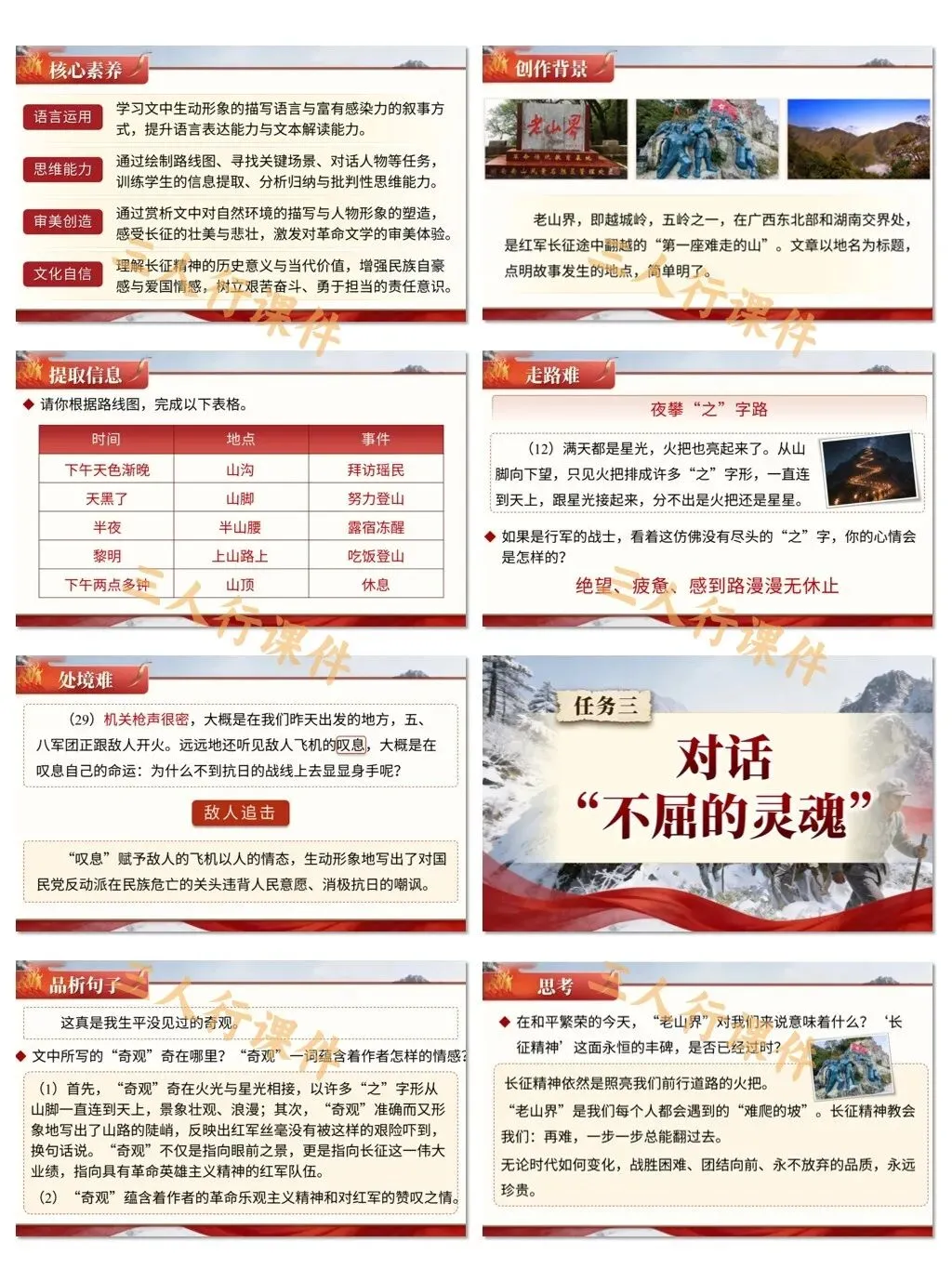 1. 审美创造:通过赏析文中对自然环境的描写与人物形象的塑造,感受长征的壮美与悲壮,激发对革命文学的审美体验。