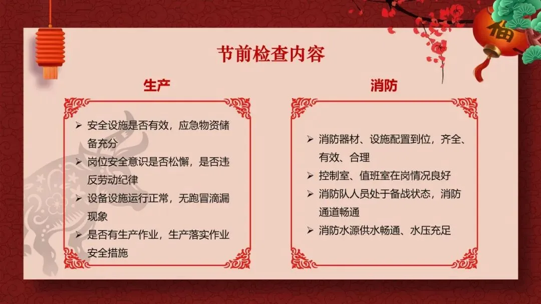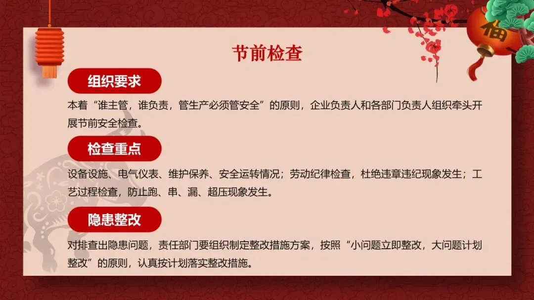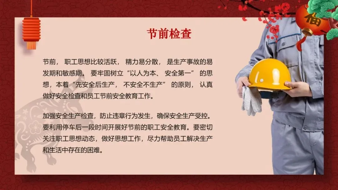 节前,职工思想比较活跃,精力易分散,是生产事故的易发期和敏感期。要牢固树立"以人为本、安全第一"的思想,本着"先安全后生产,不安全不生产"的原则,认真做好安全检查和员工节前安全教育工作。