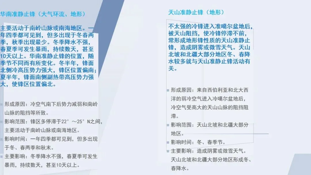 (2)西路冷空气受高大山脉的阻挡,阻挡作用强,势力较弱;东路冷空气经过地势低平的河西走廊和河谷地区,阻挡作用弱,且有狭管效应,势力较强。