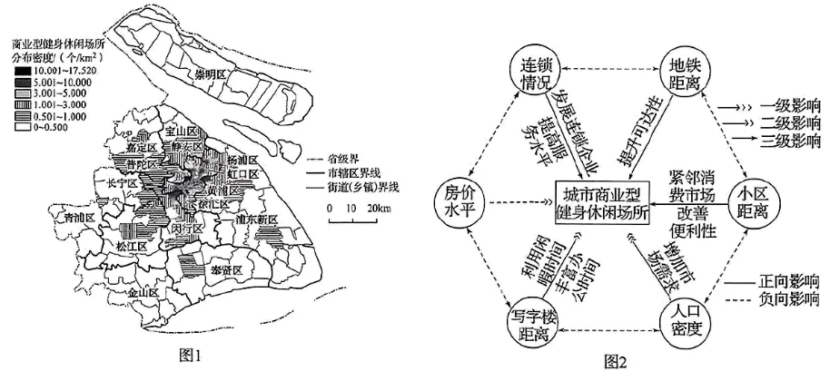 下图1为上海市商业型健身体闲场所分布密度图,图2为上海市商业型健身休闲场所空间格局及影响机理。读图,完成下面小题。