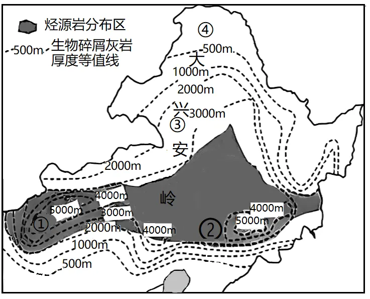 我国东北地区在约2.8亿年前为半深海-滨浅海沉积环境,发育有巨厚的生物碎屑灰岩;在约2.5亿年前为滨浅湖沉积环境,发育有厚度较大的烃源岩。下图示意东北地区局部生物碎屑灰岩厚度和烃源岩分布状况。据此完成下面小题。