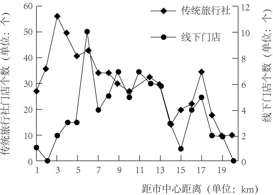 知名旅游互联网企业X公司主要提供线上酒店预订、交通预订、旅游度假预订、线路定制与咨询等服务。自2017年起,X公司定位商旅客户、中老年客户等目标人群,加大线下门店铺设力度,由线上销售旅游服务产品向“店商+电商”新模式转变。下图示意该企业线下门店和传统旅行社门店数量随与上海市中心距离变化分布情况。完成下面小题。