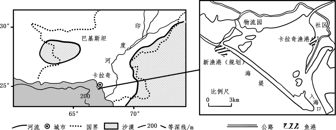 卡拉奇位于印度河三角洲,历史上为印度洋沿岸的渔村。20世纪中叶,卡拉奇渔港成为巴基斯坦最大的渔港,但多以小船捕获近海渔业资源为主。近年来,随着渔业捕捞量增多,渔港内加工和冷藏技术落后导致大量海鲜变质,附近社区居民因大气污染严重要求搬迁渔港的呼声越来越高。当前该国积极邀请中国规划、共建卡拉奇新渔港,新渔港配套建产业园。图示意卡拉奇渔港周边地理事物分布。