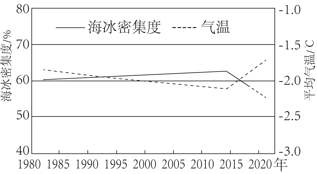 海冰区反照率是指有海冰覆盖的水域对太阳辐射的反射率,其大小与海冰密集度、气温等密切相关,海冰和海水反照率差异大。下图示意1983—2022年南极海冰区夏季海冰密集度、平均气温的年际变化。