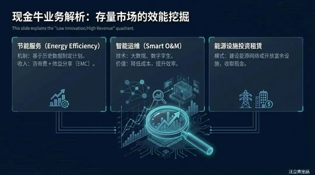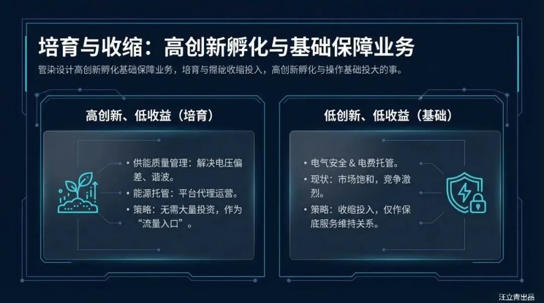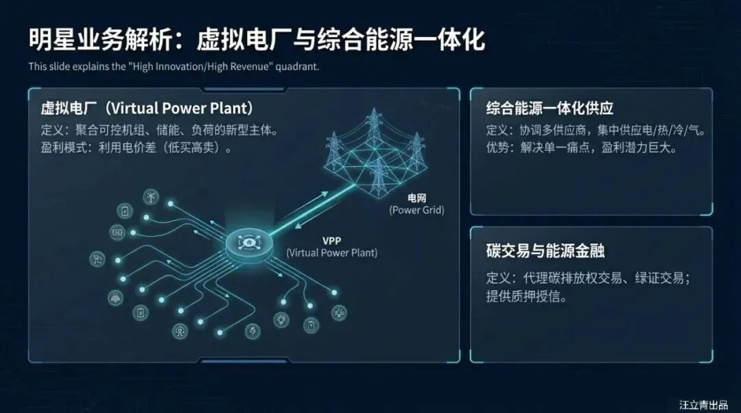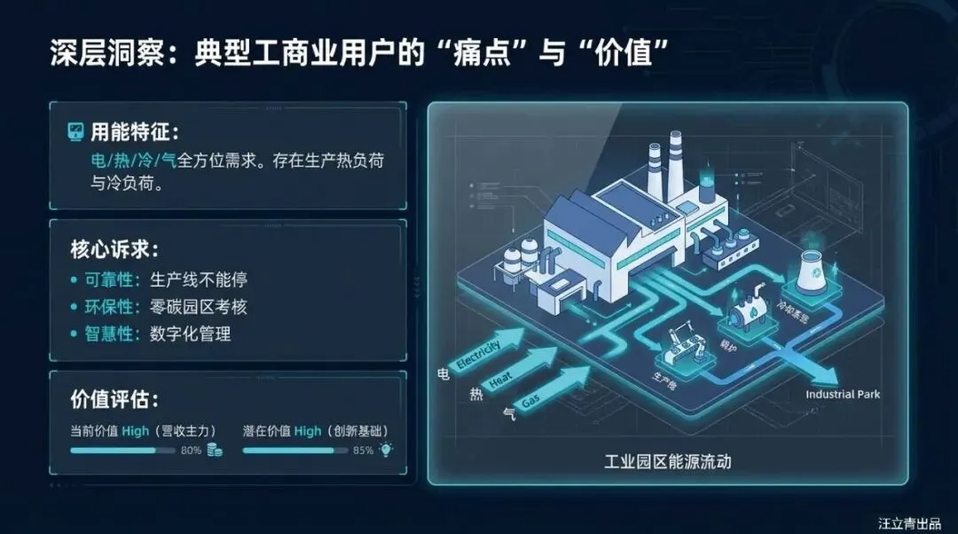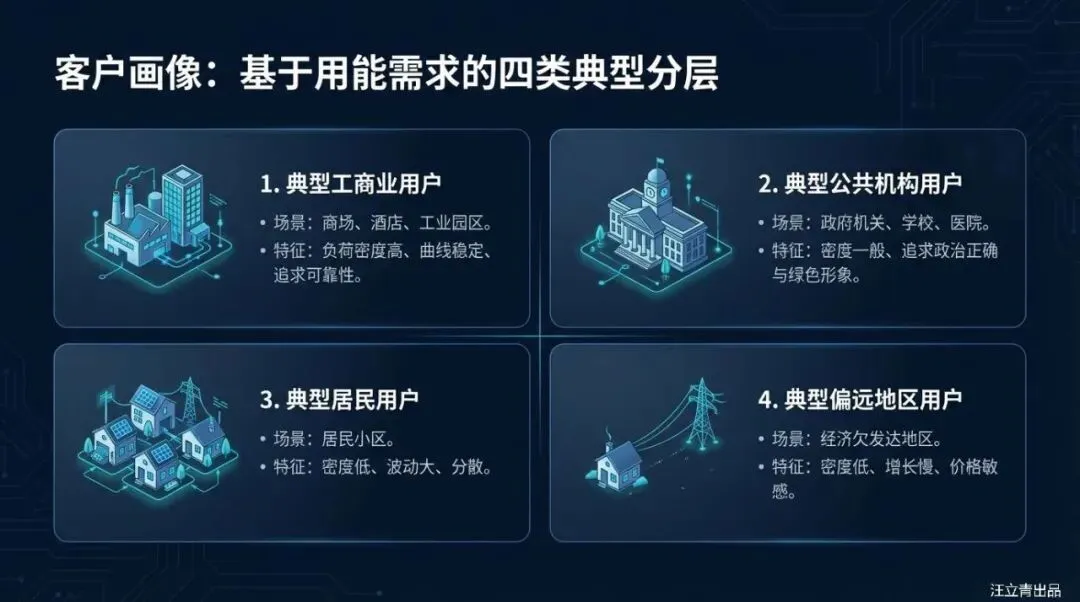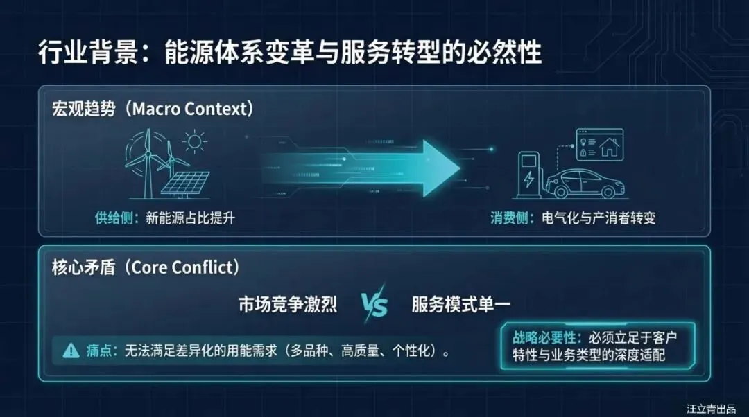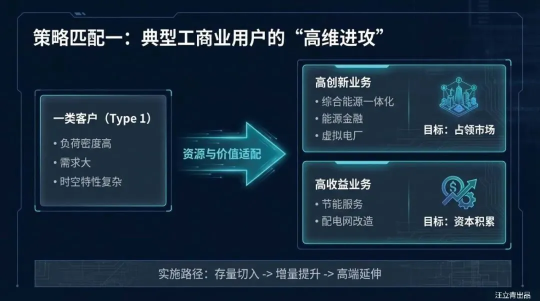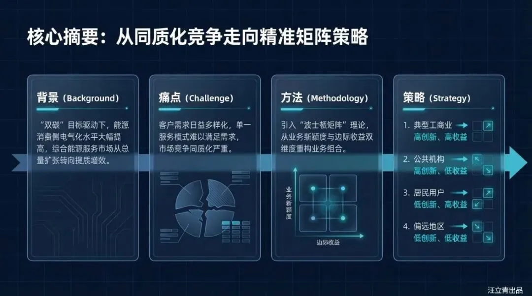 这份报告聚焦于“双碳”目标下综合能源服务企业面临的市场挑战,针对客户需求日益多样化与单一服务模式之间的矛盾,提出了一种基于客户差异化的业务设计策略。报告首先深入分析了四类典型客户(工商业、公共机构、居民、偏远地区)的用能特征,指出它们在负荷密度、用能稳定性以及对经济性、可靠性、环保性的追求上存在显著差异。同时,报告引入波士顿矩阵理论,从“业务新颖程度”和“边际收益提升程度”两个维度,将综合能源业务划分为四种类型:处于孵化期且前景广阔的“高创新、高收益”业务(如虚拟电厂、碳交易),作为主要营收来源的“低创新、高收益”业务(如节能服务),需要深挖价值的“高创新、低收益”业务(如能源托管),以及市场饱和的“低创新、低收益”业务(如电费托管)。报告的核心逻辑在于通过精准匹配客户价值属性与业务发展潜力,构建定制化的服务模式。