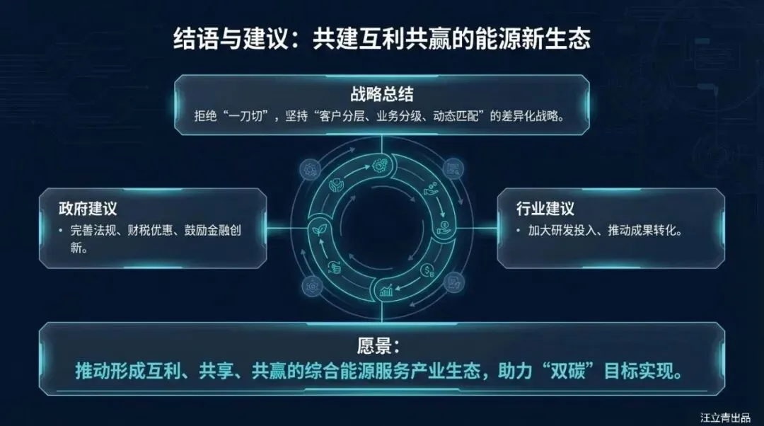 基于上述分析,报告制定了具体的差异化匹配策略。对于高负荷密度、高价值的典型工商业用户,建议推广虚拟电厂及综合能源一体化供应等高创新、高收益业务,以抢占增量市场;对于追求稳定可靠的公共机构用户,重点开展设备投资租赁及能源大数据等高创新、低收益业务,以积累创新经验;对于潜在价值高但当前分散的居民用户,侧重于节能改造等低创新、高收益业务,以提升用户粘性;而对于偏远地区用户,则主要提供电气安全等低创新、低收益的保底服务,以履行社会责任并提升品牌形象。此外,报告还强调了外部环境的重要性,建议通过强化政策引领、加大关键技术研发(如云边端协同、大数据分析)以及推动跨行业社会合作,构建互利共赢的综合能源服务产业生态,从而实现企业服务能力的全面提升与行业的高质量发展。