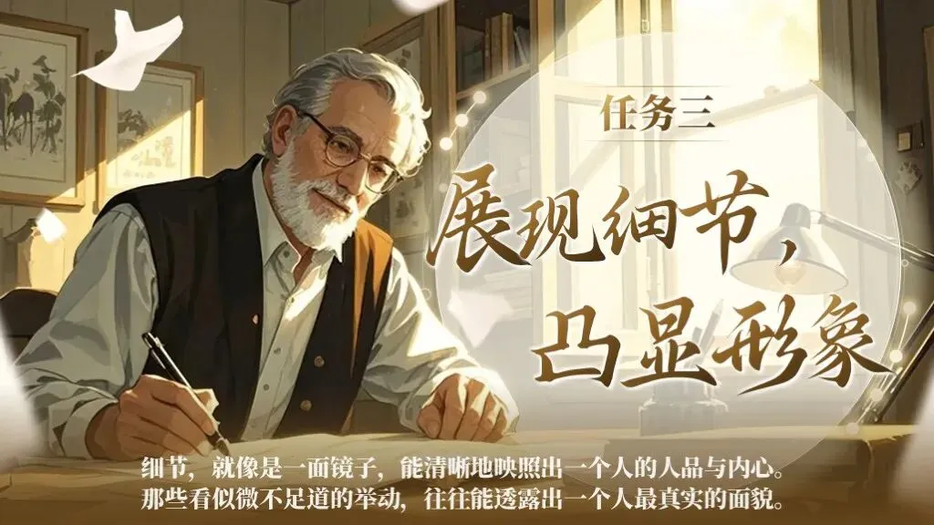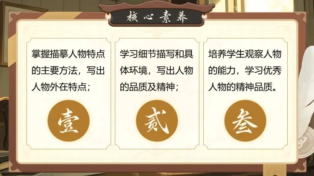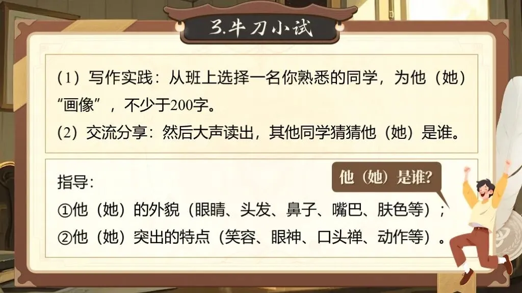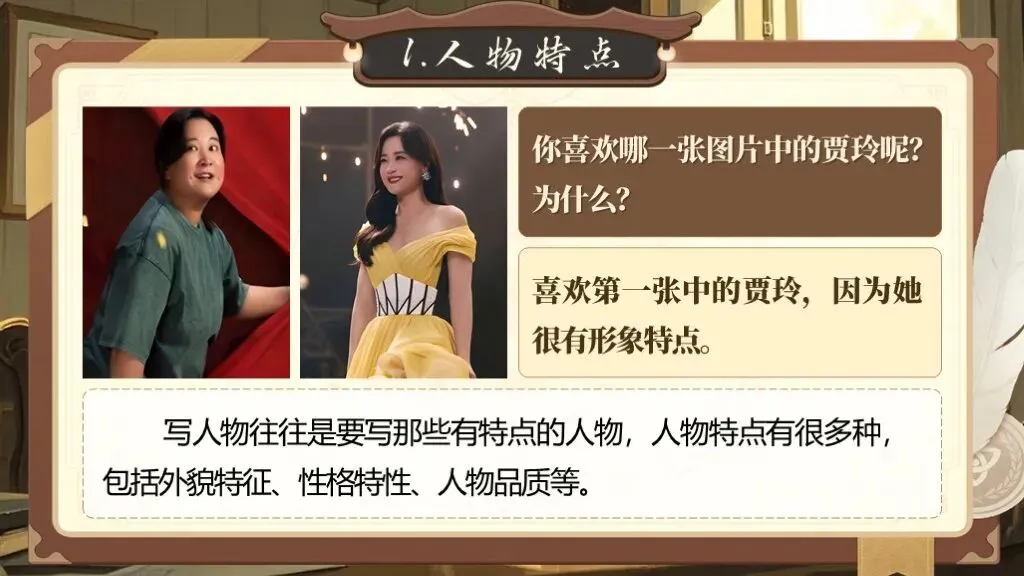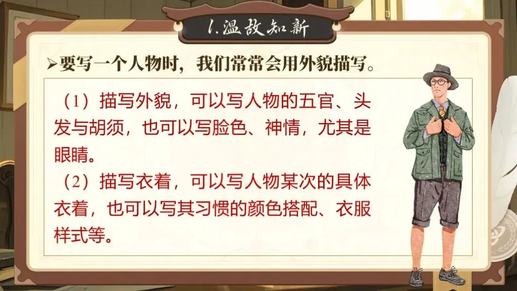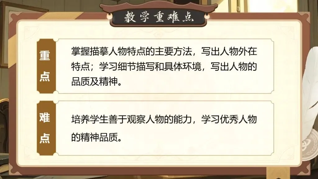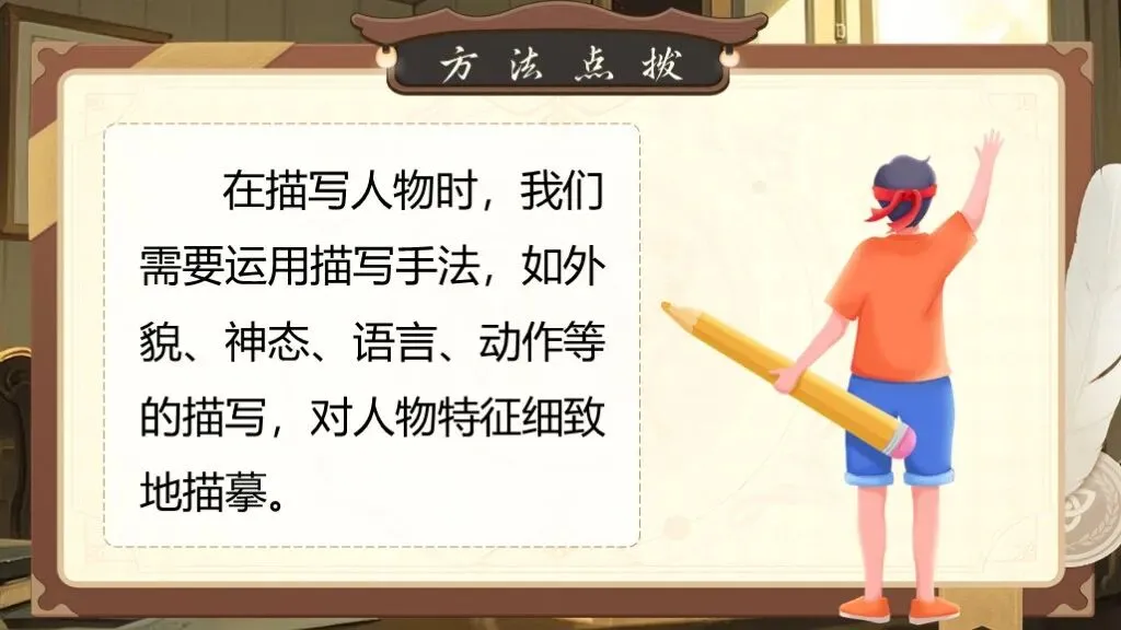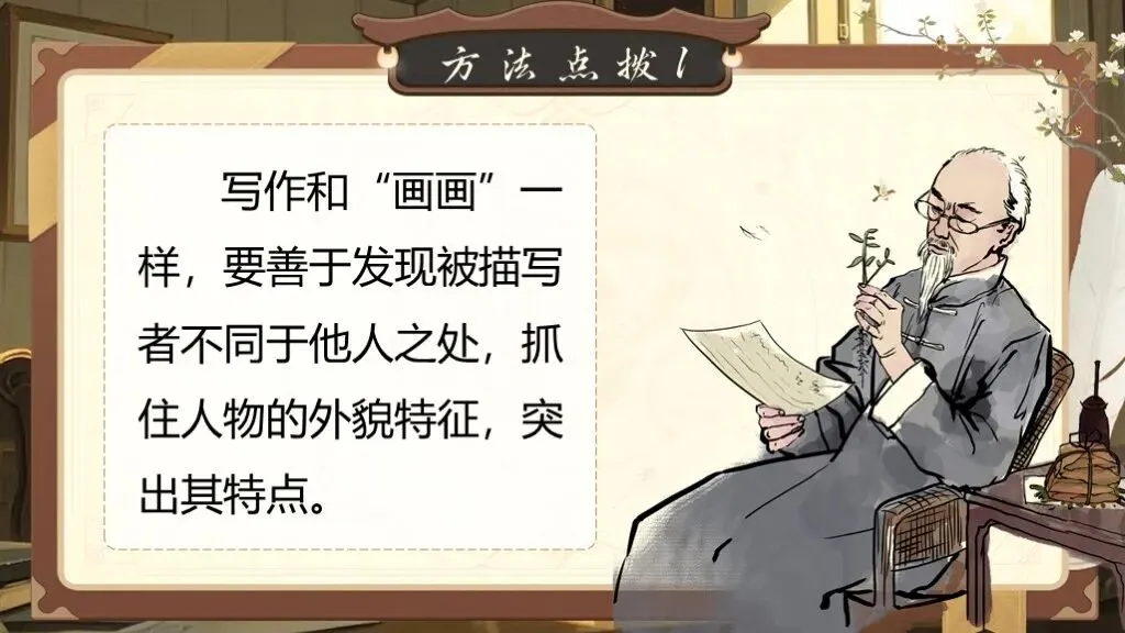 第一单元的写作要求是“写出人物特点”,这一单元的写作目的是要指导学生如何抓住人物的特点来写人,从而突出人物的性格特点。除了要对人物进行外貌描写,还要将人物放进特定的环境中,通过细节描写突出人物的性格特征,展现人物精神及品质。