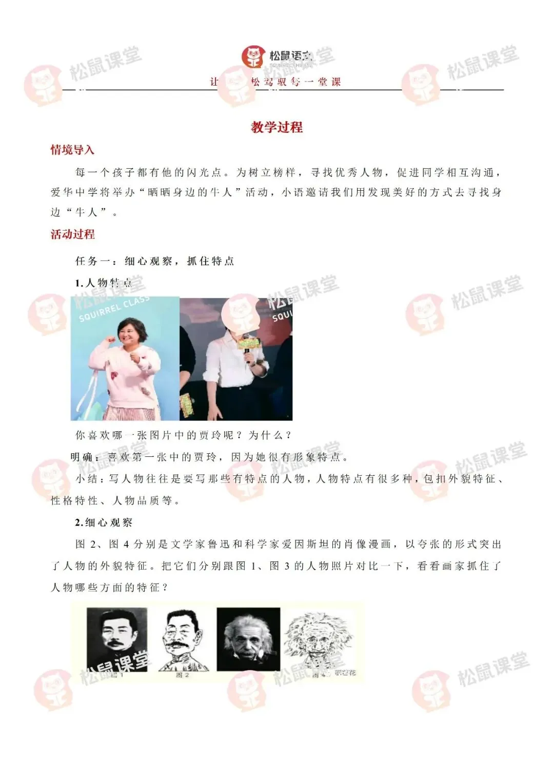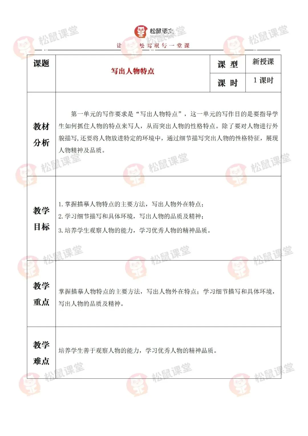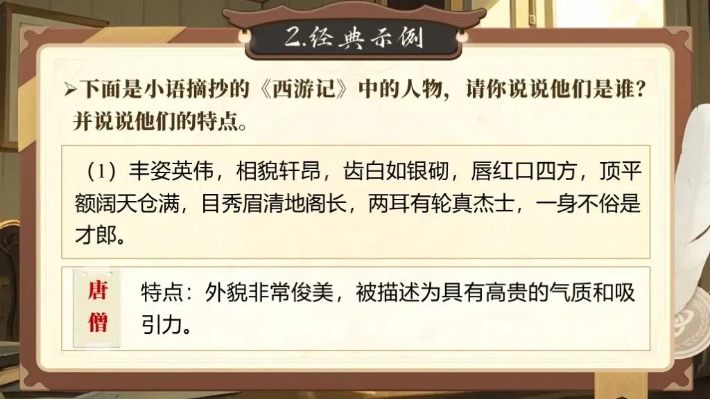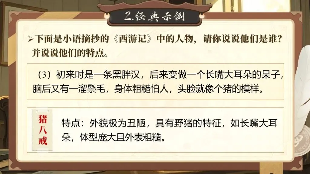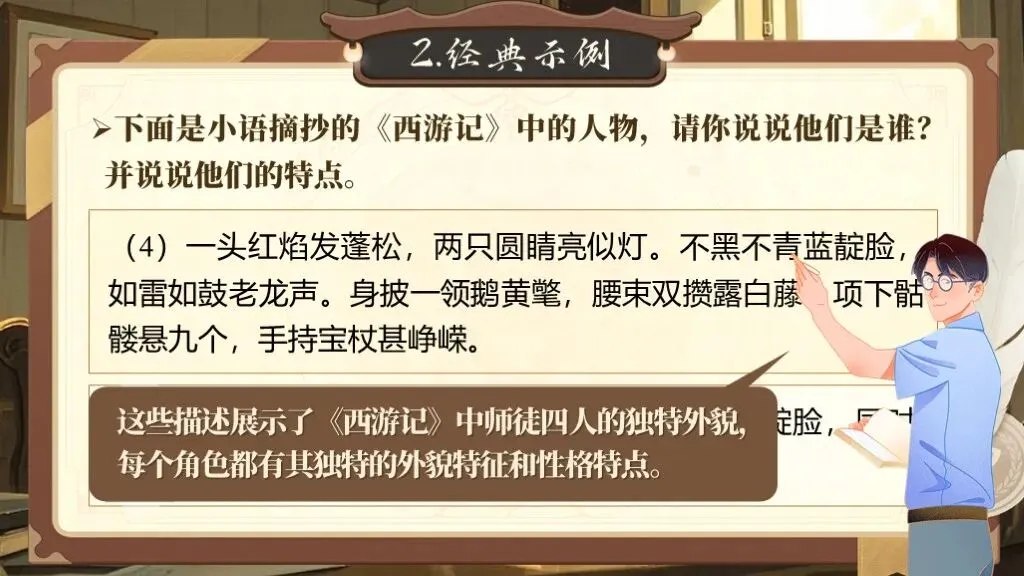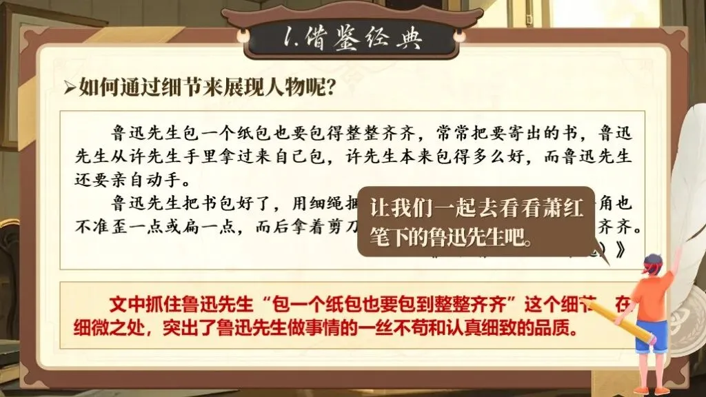 第一单元的写作要求是“写出人物特点”,这一单元的写作目的是要指导学生如何抓住人物的特点来写人,从而突出人物的性格特点。除了要对人物进行外貌描写,还要将人物放进特定的环境中,通过细节描写突出人物的性格特征,展现人物精神及品质。