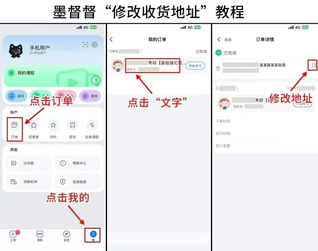 4.修改地址方式:墨督督app-右下角-我的-订单-地址处编辑新地址-保存(注意:这个是修改地址的【唯一】有效路径)(见下图)