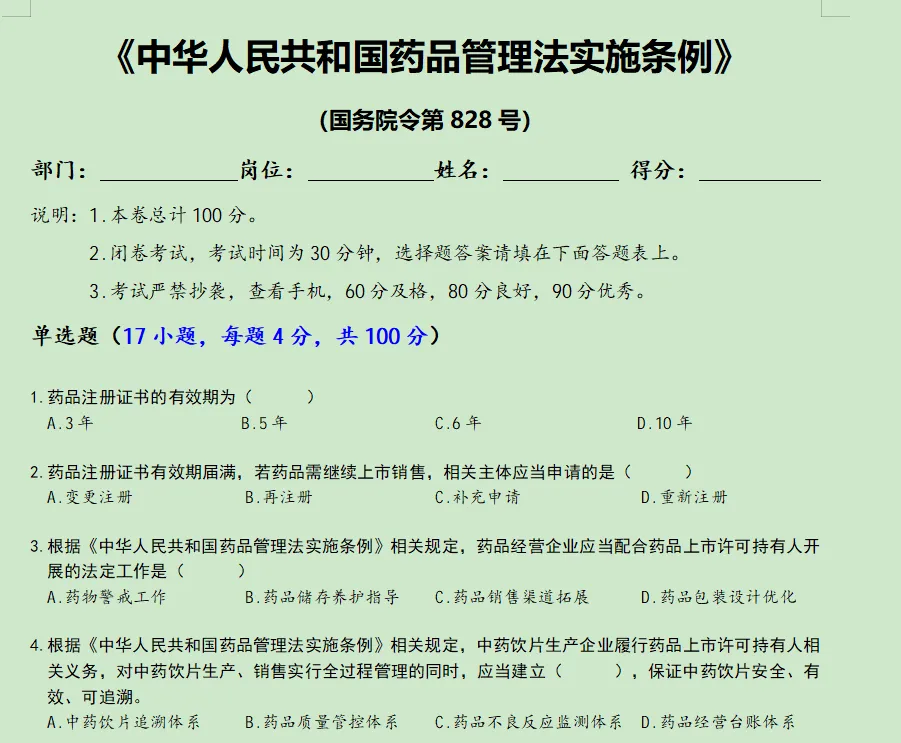 >药品管理法实施条例培训课件及试题