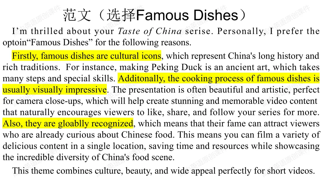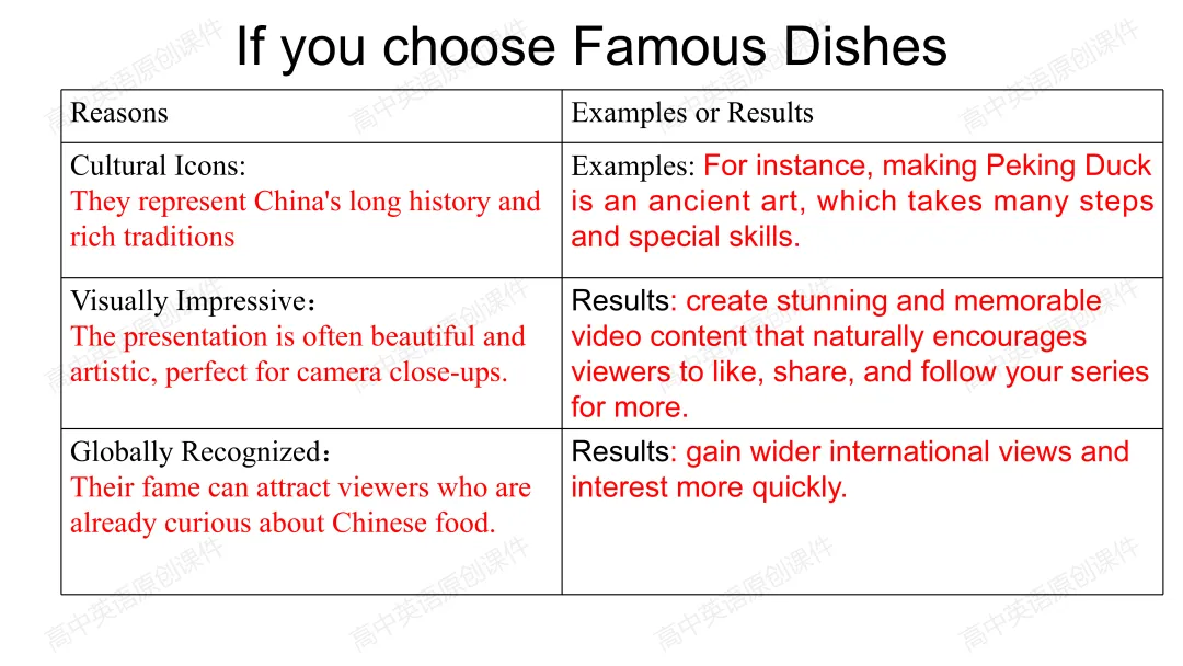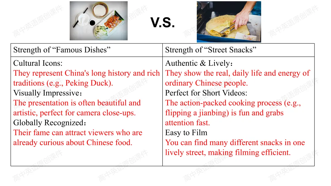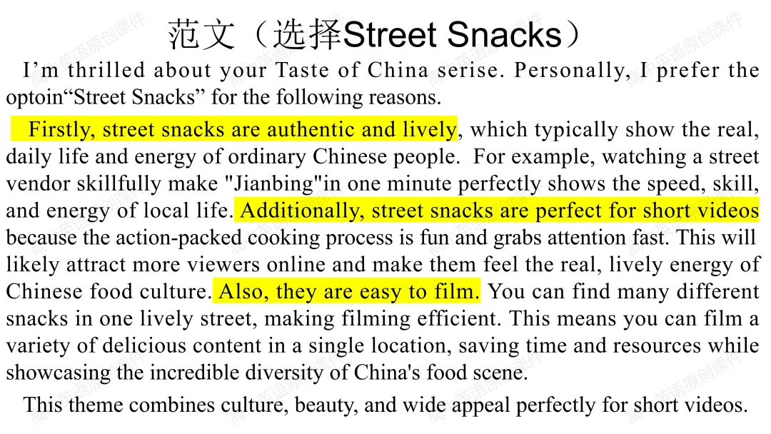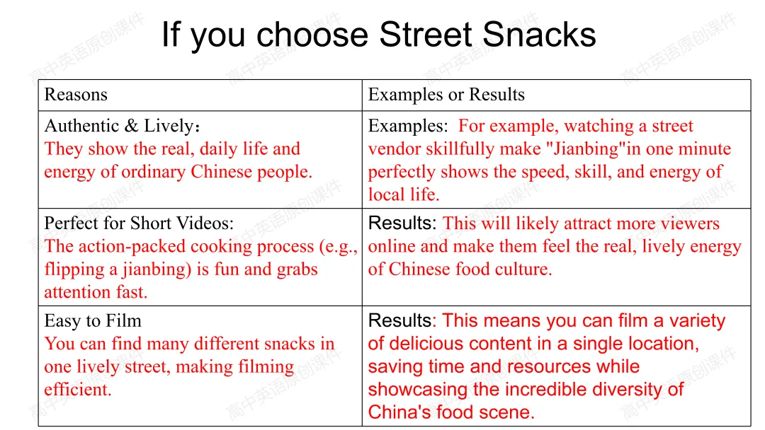 这一次的题目是围绕“推介中国美食的短视频系列”展开讨论,要从“Famous Dishes”和“Street Snacks"两个拍摄主题中选择一个,并说明原因。主题覆盖了科技(短视频)、艺术(拍摄)以及美食,往大一点还可以衍生出中国文化遗产,但要注意分寸。