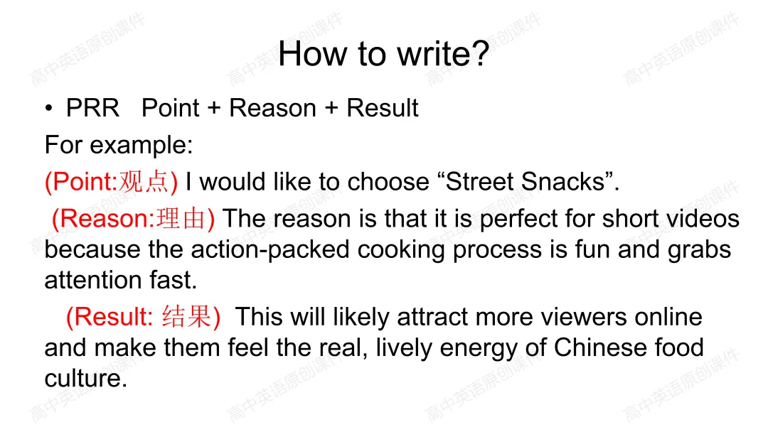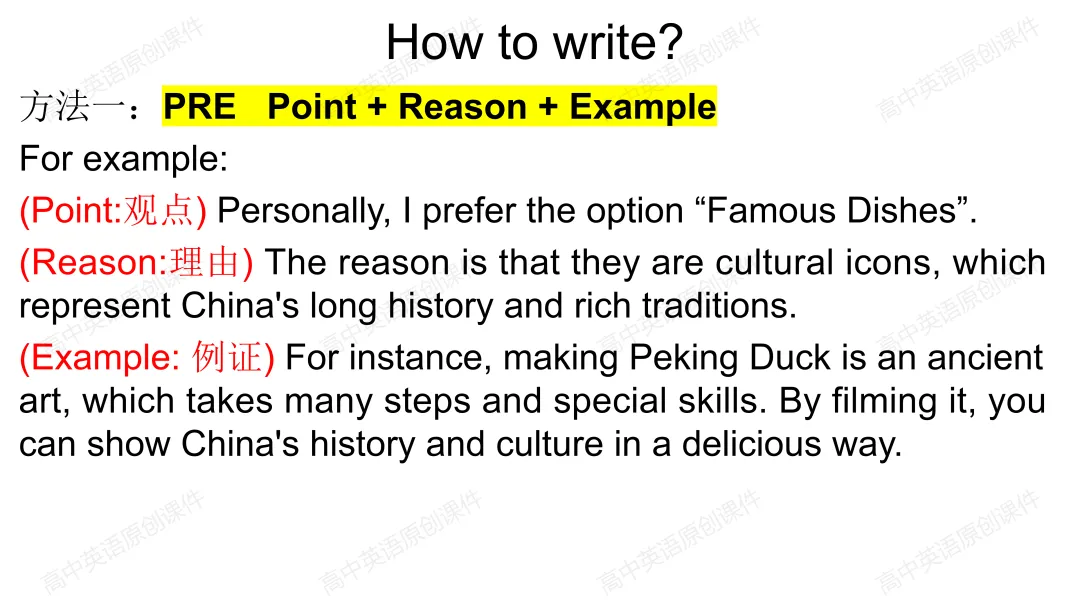 那选定理由后,我们要如何教会学生展开呢?这里推荐两种写作模式:一个是PRE,