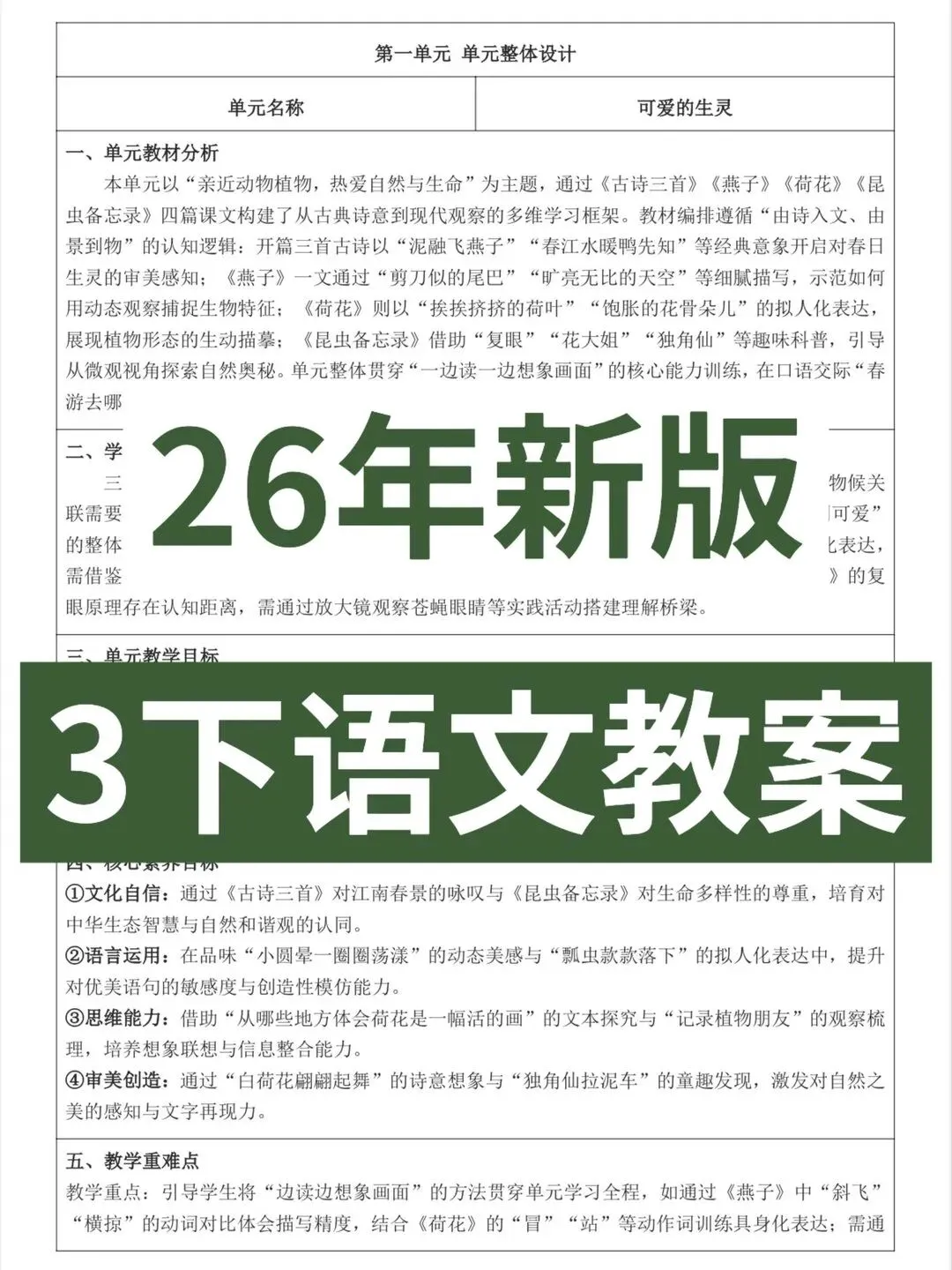 ️ 26年全新教材核心素养教案 ️ 3年级下册语文全面更新 ️ 大单元整体设计教案 【单元教材分析】【学情分析】【核心素养目标】 教师活动学生活动设计意图二次备课 学校要求的统统都有 [派对R] 教案在手,备课不愁,好好过个寒假~
