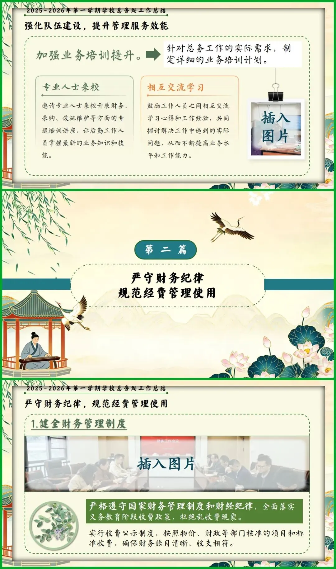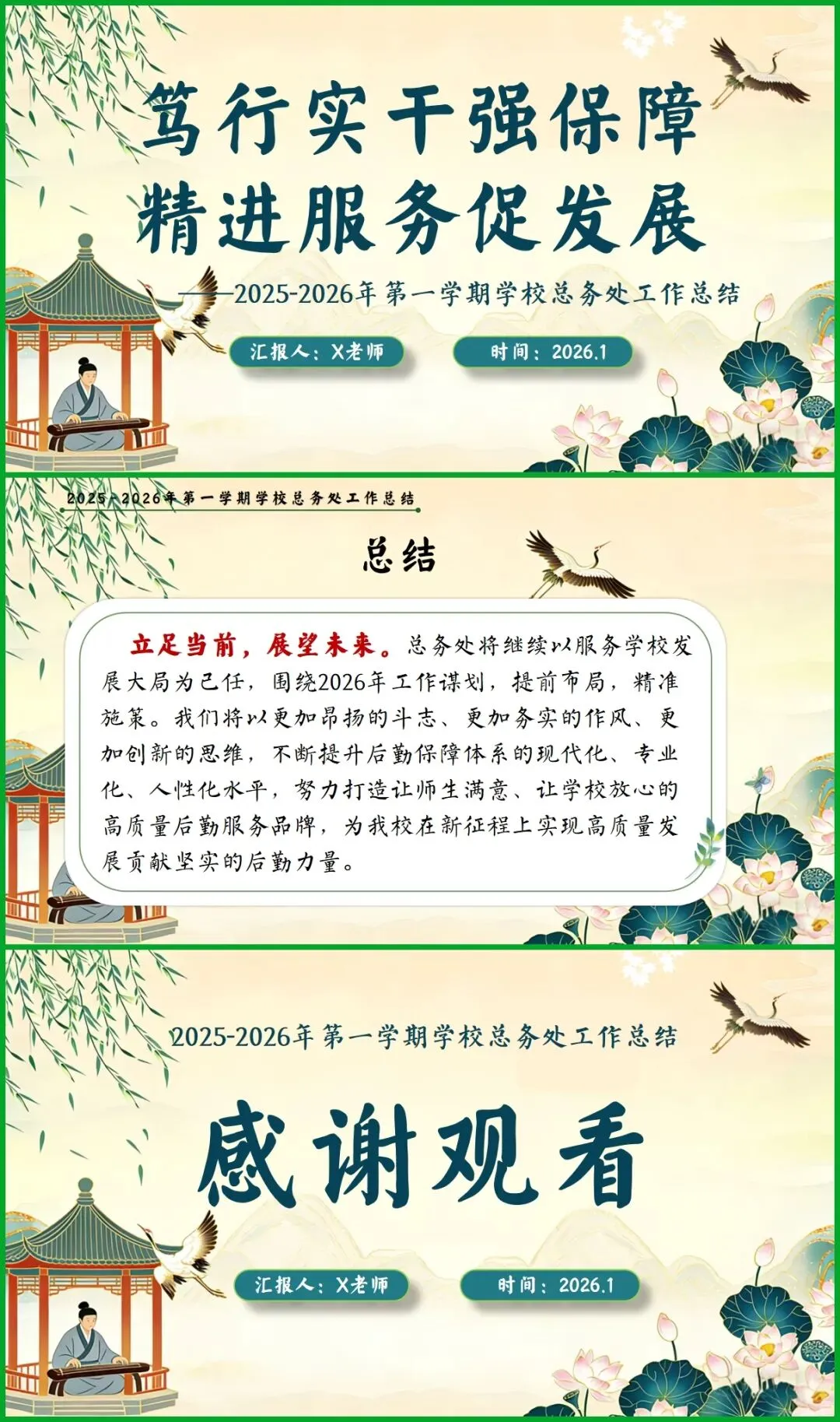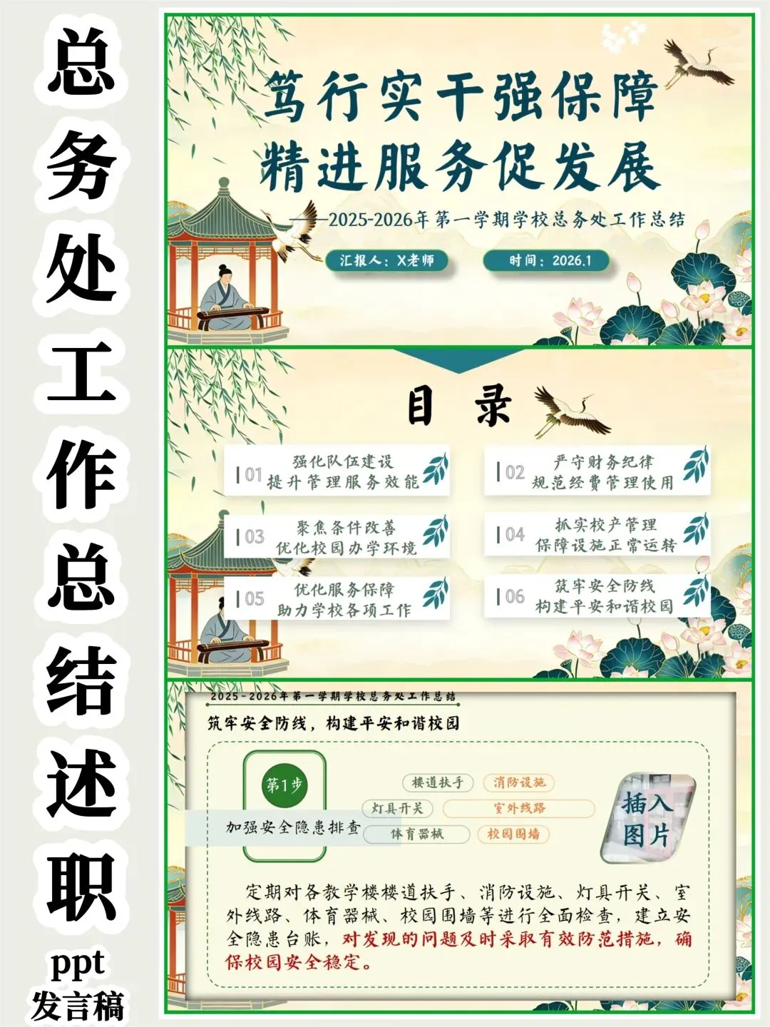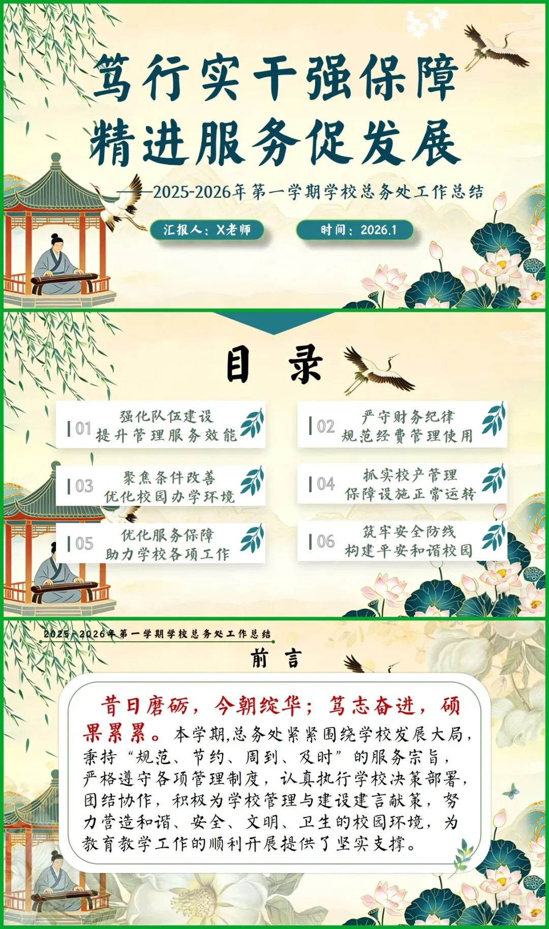 教育圈的宝子们看过来!挖到这份总务处期末述职报告PPT,简直是后勤人的福音! 新中式国风设计超雅致,亭台、荷鹤元素意境拉满。从队伍建设、财务规范到校园改善、安全保障,六大板块逻辑清晰,把后勤工作的细致和专业全讲透了。 文字框架和配图占位都给你做好了,填上数据和照片就能直接用,再也不用熬夜写报告!颜值与实力并存,述职时稳稳拿捏全场!