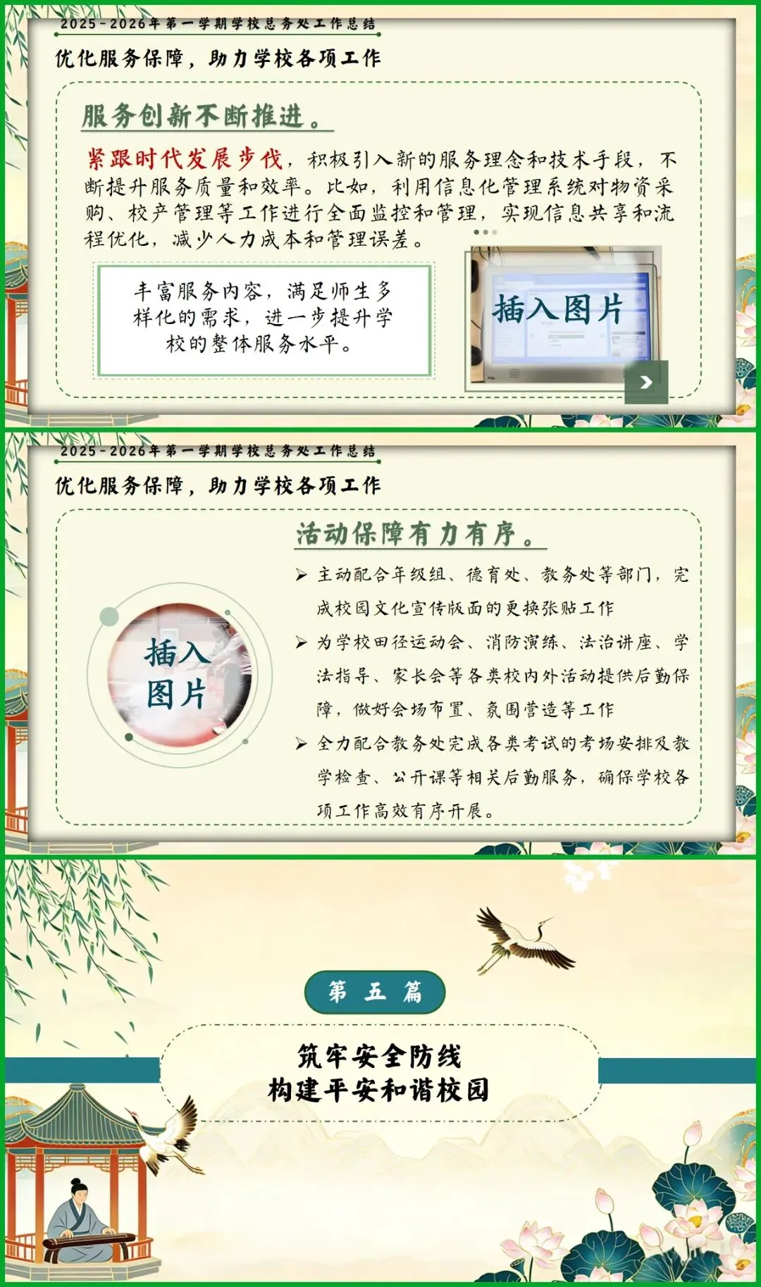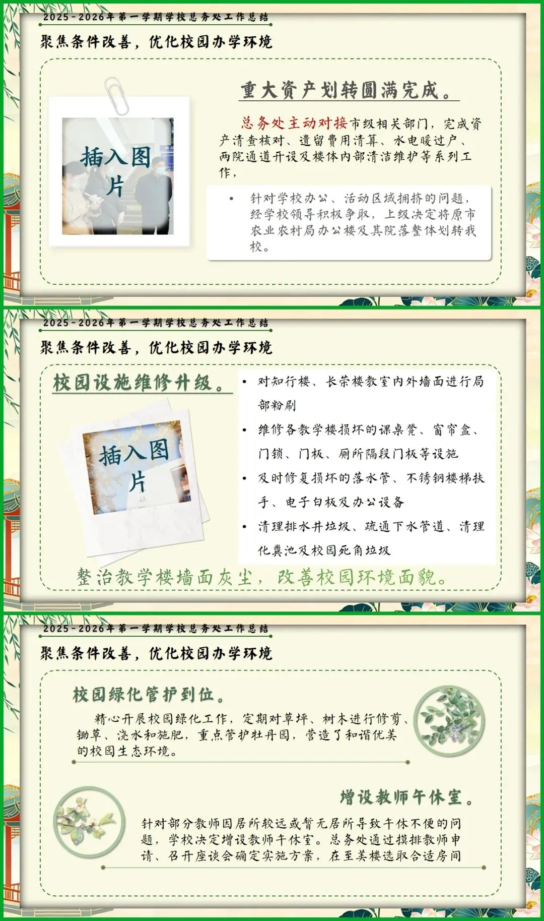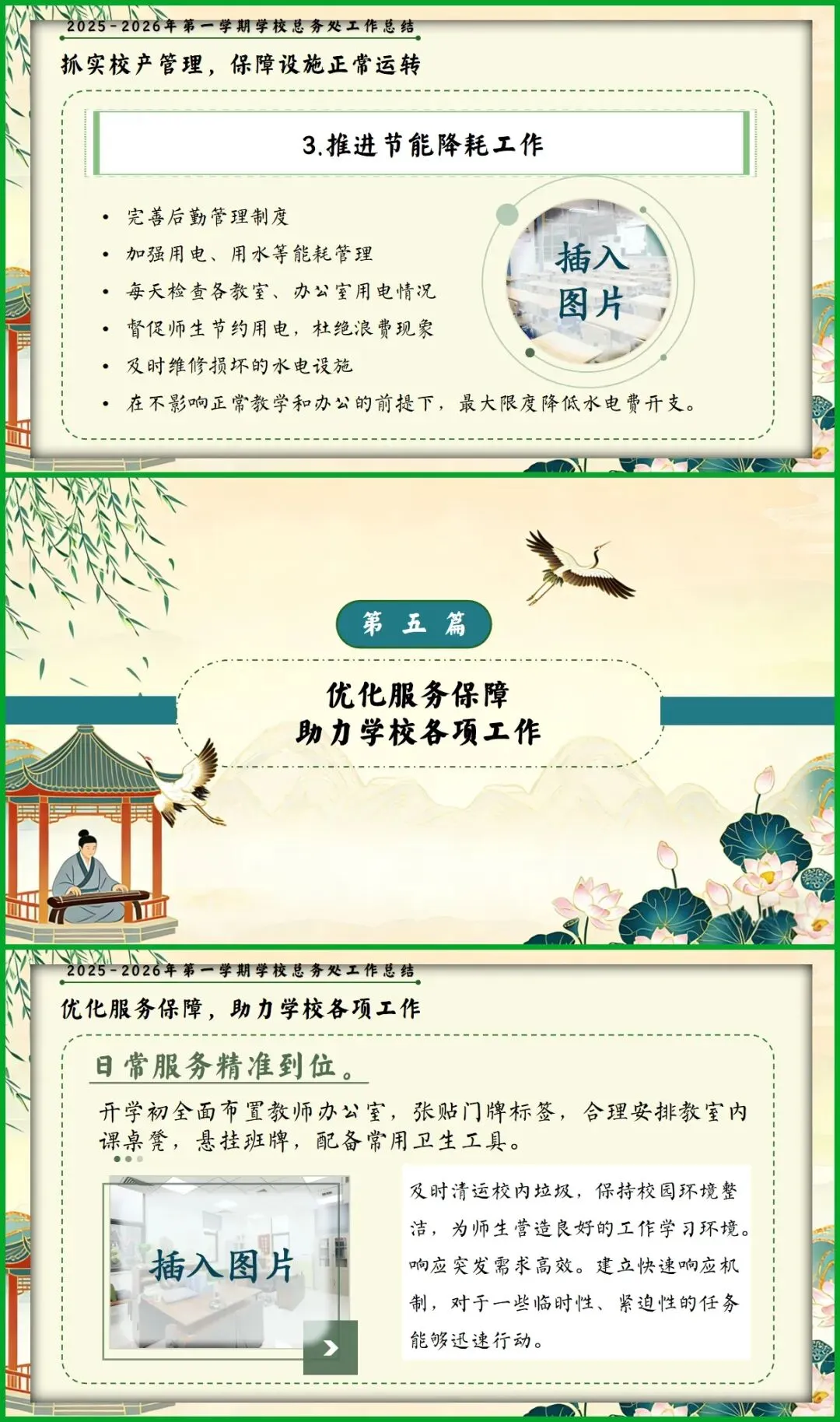 教育圈的宝子们看过来!挖到这份总务处期末述职报告PPT,简直是后勤人的福音! 新中式国风设计超雅致,亭台、荷鹤元素意境拉满。从队伍建设、财务规范到校园改善、安全保障,六大板块逻辑清晰,把后勤工作的细致和专业全讲透了。 文字框架和配图占位都给你做好了,填上数据和照片就能直接用,再也不用熬夜写报告!颜值与实力并存,述职时稳稳拿捏全场!