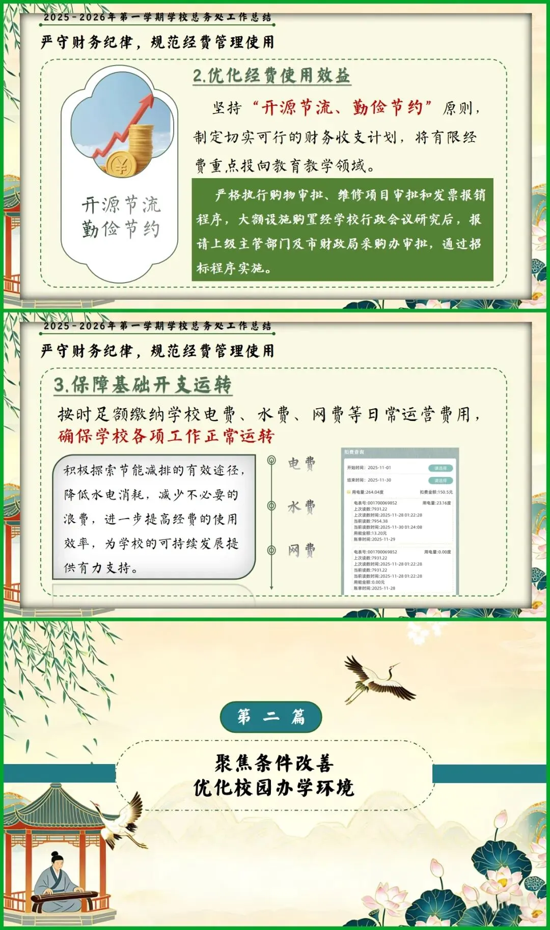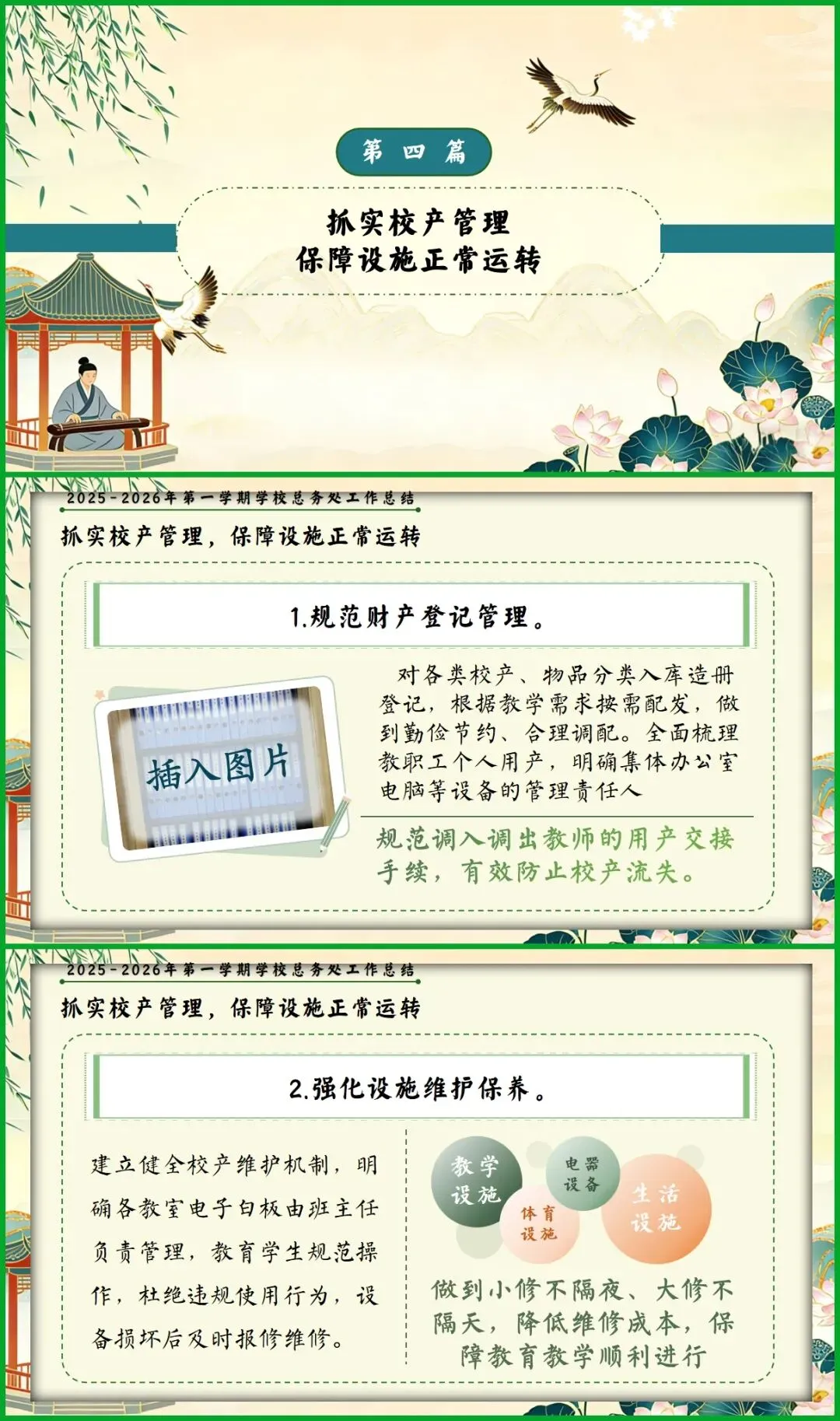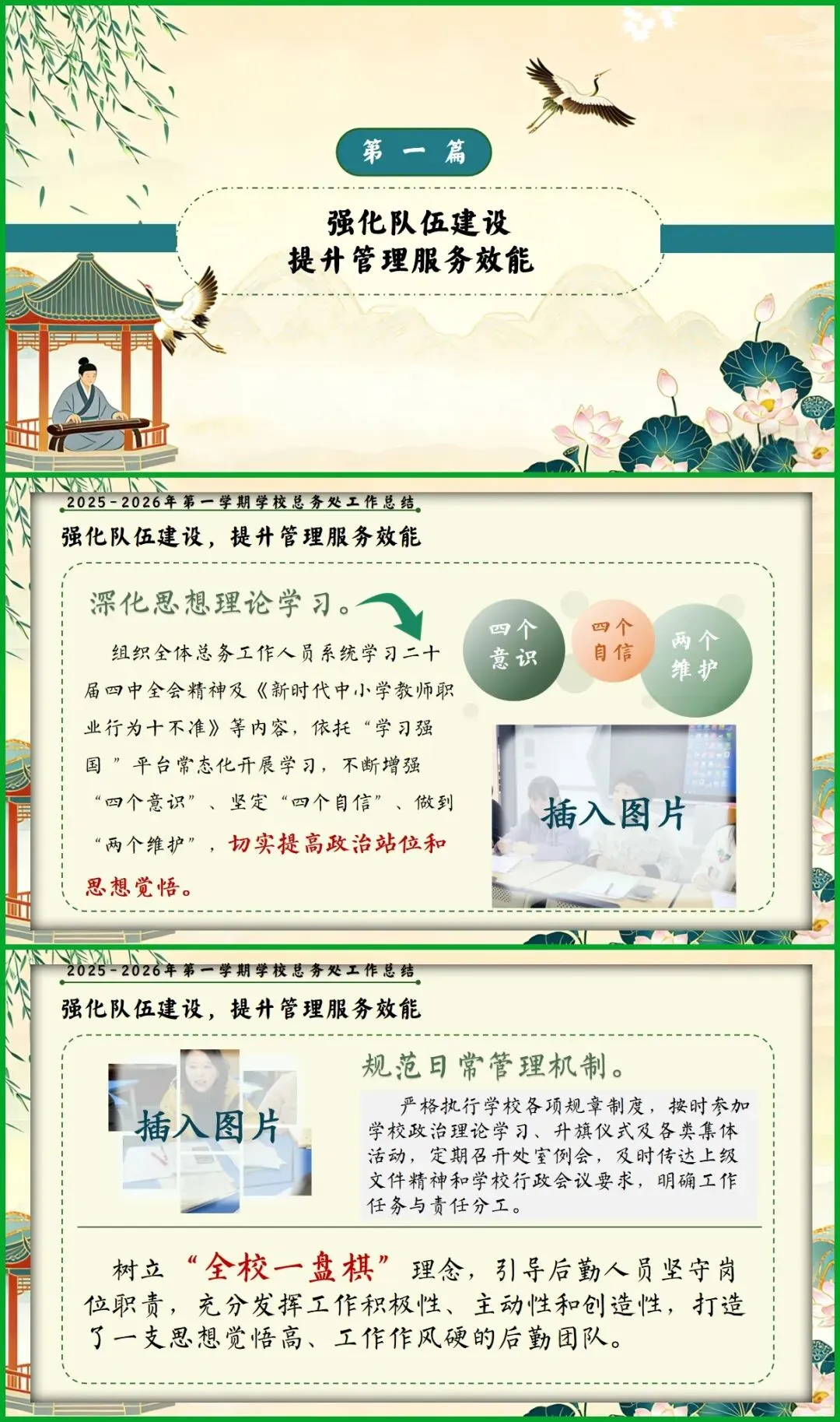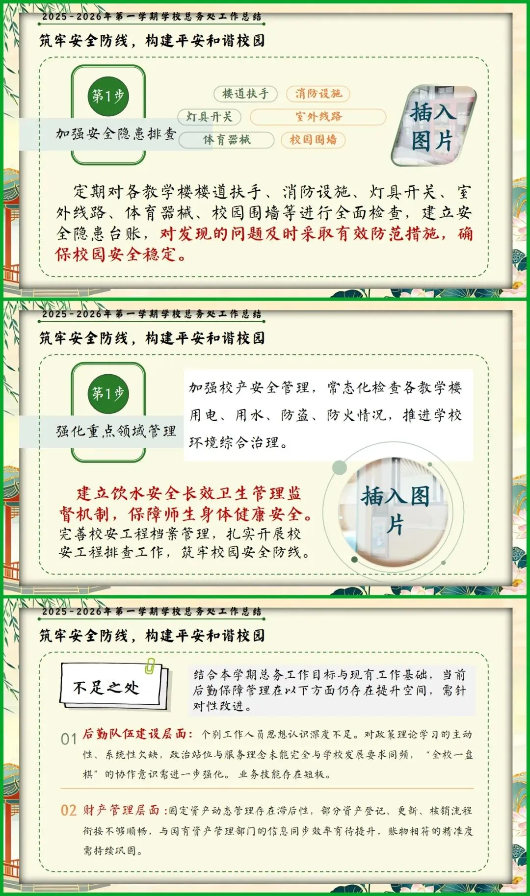 教育圈的宝子们看过来!挖到这份总务处期末述职报告PPT,简直是后勤人的福音! 新中式国风设计超雅致,亭台、荷鹤元素意境拉满。从队伍建设、财务规范到校园改善、安全保障,六大板块逻辑清晰,把后勤工作的细致和专业全讲透了。 文字框架和配图占位都给你做好了,填上数据和照片就能直接用,再也不用熬夜写报告!颜值与实力并存,述职时稳稳拿捏全场!