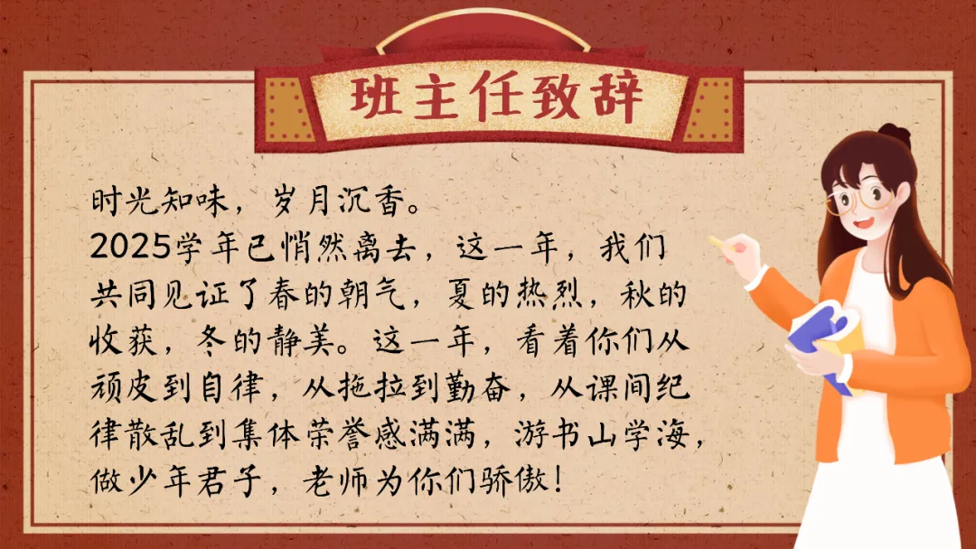 2025学年已悄然离去,这一年,我们共同见证了春的朝气,夏的热烈,秋的收获,冬的静美。这一年,看着你们从顽皮到自律,从拖拉到勤奋,从课间纪律散乱到集体荣誉感满满,游书山学海,做少年君子,老师为你们骄傲!