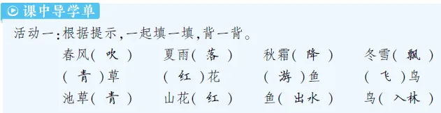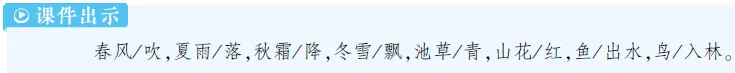 接下来请同学们来和老师对一对,老师读每个短语前面的内容,同学们来接上后面的内容。比如老师说“春风”,你们说“春风吹”。(师生合作读)