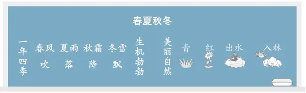 1.正确认读“霜、吹”等8个生字,会写“春、冬”2个字。 2.通过结合插图、想象画面等方法,了解词语和短语的意思,感受四季不同的特征。 3.在多种形式的诵读中积累语言,感受语言的音韵美。