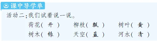 板块二观察插图,识字学词 谁来读一读这些词语?(课件出示“青草、红花、游鱼、飞鸟”4个词语,指名读。)