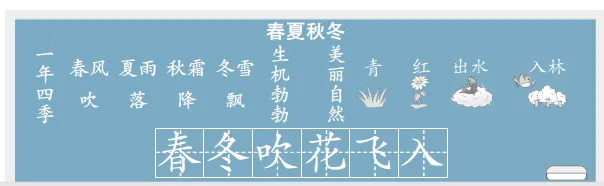 《春夏秋冬》是一篇看图识字课文,由插图及相互关联的词语和短语组成。教学重点为识字与写字。识字时,我通过比较同偏旁的字、运用看图猜想及动作演示等方式帮助学生认识生字和动词,如嘟起小嘴学着春风“吹一吹”,小手比出下降和雪花飘飘的动作。写字教学采用了形近字对比的方法,如“入”与“人”字相比较,撇和捺的长短不同。但这节课远超计划课时,比动作时,学生太激动喊停却不能及时停下来;讲到有趣的地方也要哈哈哈笑一会儿;口头组词时,学生有时会把同音字混淆,比如在给“降”组词时,有的学生组了“番茄酱”“酱油”,这时我又得临时增加相关知识的讲解。 |
