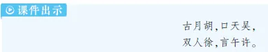 “春”字先写三横,左低右高,间距均匀,中间一横最短,最后一横稍长;再写一个“人”字,撇、捺要舒展;最后写一个“日”字,贴住撇,不碰捺。(教师范写,生练习书写“春”。)