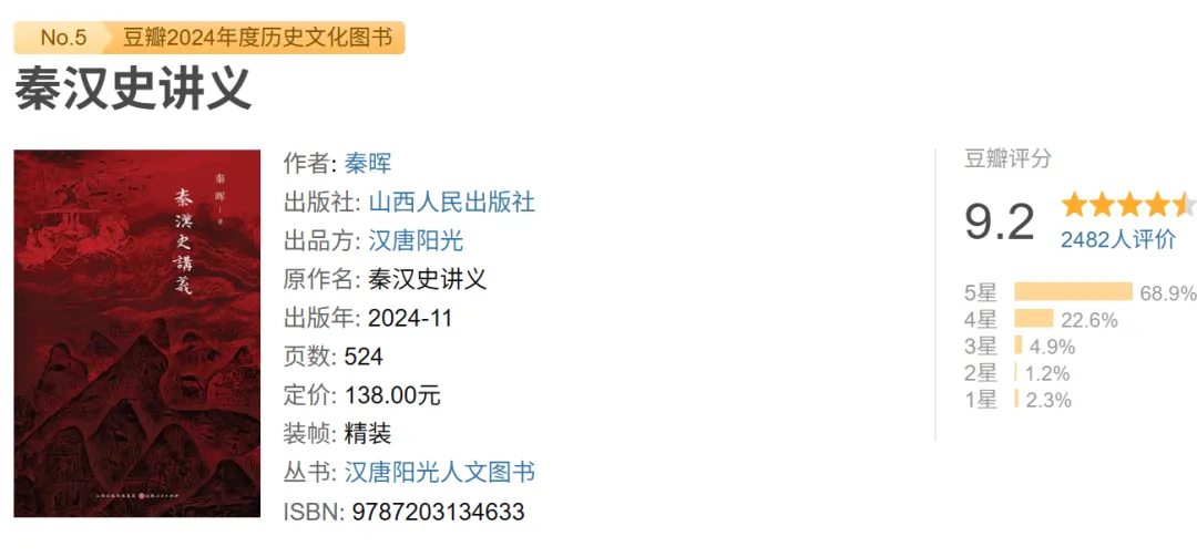 这本书出版于2024年11月,在豆瓣上的评分高达9.2分,体量也很大,总字数44万,拿在手里非常的厚重;但它原本的雏形,是秦先生早年在清华大学讲授的秦汉史课程讲义,当时还没留下完整的文字稿件,只保留了视频录像。后来有热心读者根据视频录像,自发将课程整理成文字讲义寄给秦先生。秦先生深受感动,于是在原讲义的基础上做了大幅补充和修改。这些增补修改,主要包括两个方面的内容,一是近二十年间出现的新史料,二是近二十年间出现的许多新问题,有历史问题,也有与历史相关的现实问题。