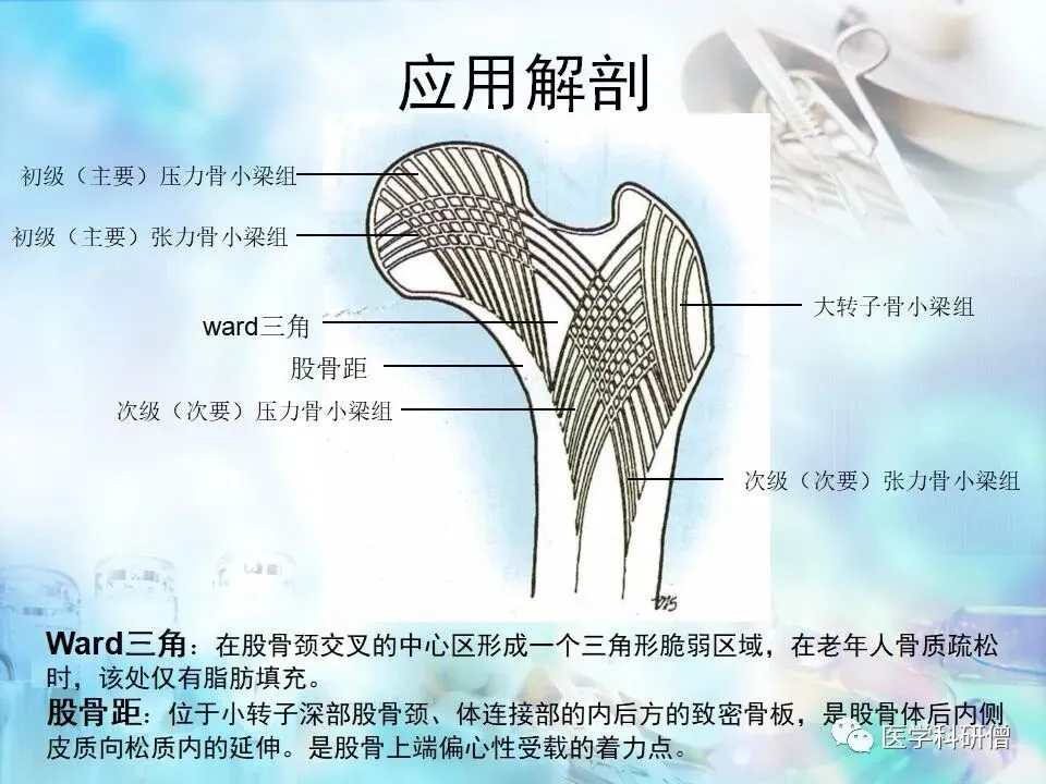 Ward三角位于股骨上端,由股骨颈内侧壁、小转子及转子间线构成,是股骨上端的重要支撑结构。股骨距则是连接大转子与小转子的骨性突起,对维持髋关节的稳定性具有重要作用。了解这些解剖学特点,有助于理解转子间骨折的发生机制及制定治疗方案。