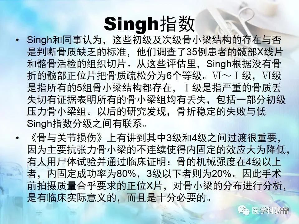 Singh指数是一种通过X线片评估骨质疏松程度的方法,主要依据股骨颈下方特定区域的骨密度变化来判断。该指数能够反映骨质的微观结构变化,对于预测骨折风险及评估治疗效果具有重要意义。