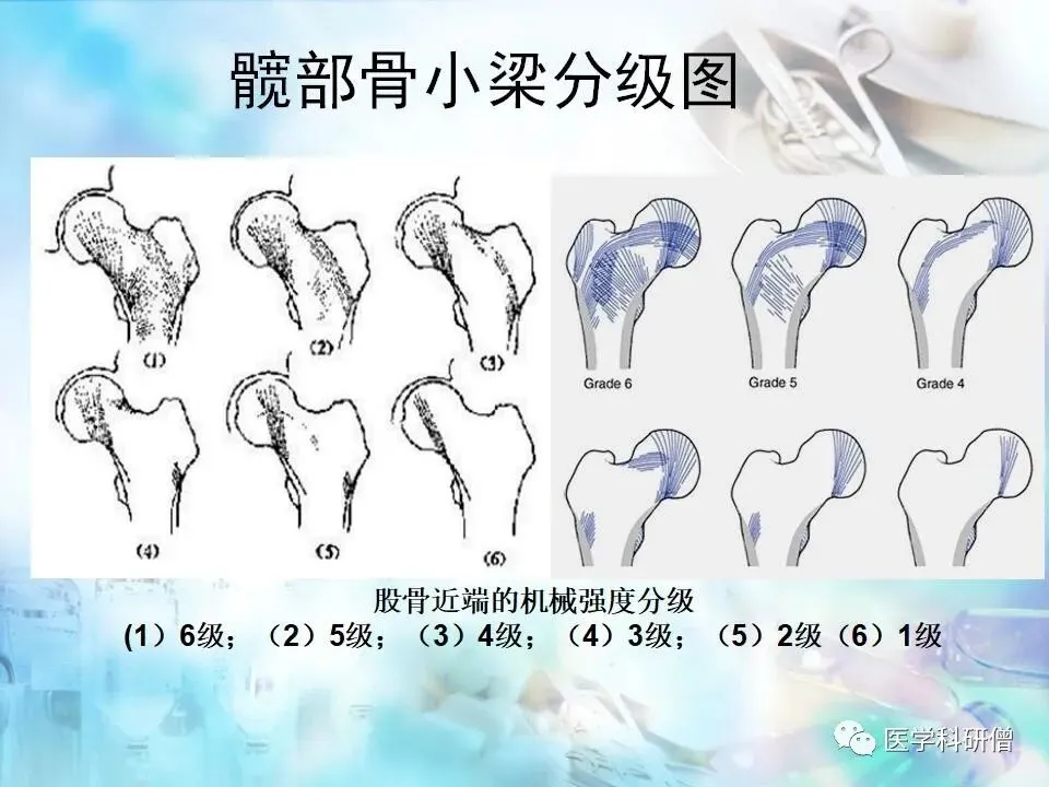 髋部骨小梁分级图是一种根据骨小梁的排列和密度对髋部骨质进行分级的方法。该方法将髋部骨小梁分为1至6级,级别越高表示骨小梁排列越紧密,骨质强度越高。通过髋部骨小梁分级图,可以直观地了解患者的骨质状况,为治疗提供重要参考。