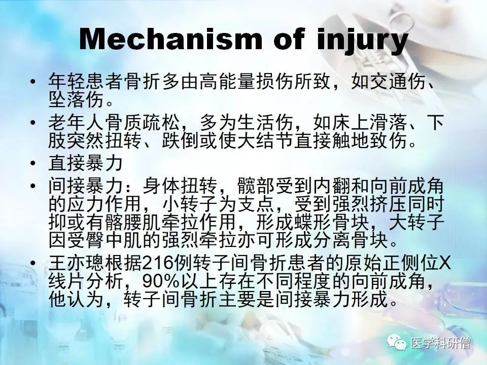 直接暴力是指外力直接作用于骨折部位,导致骨质断裂;而间接暴力则是指外力通过传导或杠杆作用,使骨质在远离外力的部位发生断裂。股骨转子间骨折多由间接暴力引起,如跌倒时臀部着地,导致股骨上端受到外力冲击而断裂。