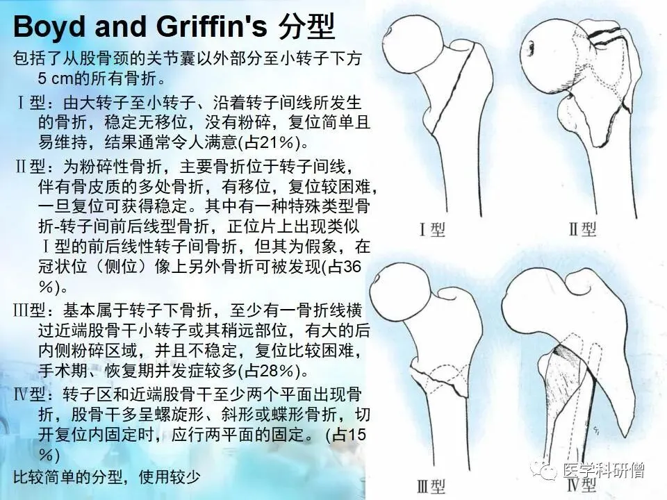 Boyd and Griffin's 分型是一种常用的股骨转子间骨折分型方法,该分型根据骨折线的位置、形态及移位程度,将转子间骨折分为四型:I型为顺转子间骨折,骨折线从股骨颈基底部向小转子方向延伸;II型为逆转子间骨折,骨折线从股骨颈基底部向大转子方向延伸;III型为转子间粉碎性骨折,骨折线呈不规则状,骨折端碎块较多;IV型为转子下骨折,骨折线位于小转子下方。每种类型都有其特定的治疗方法和预后情况,为临床治疗提供了重要参考。