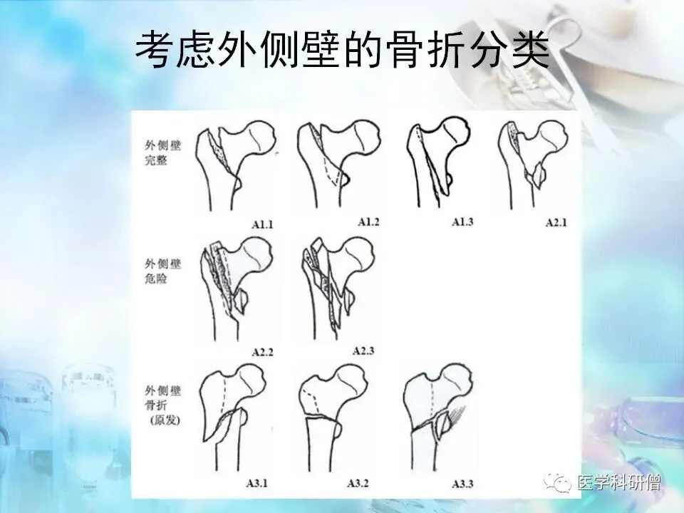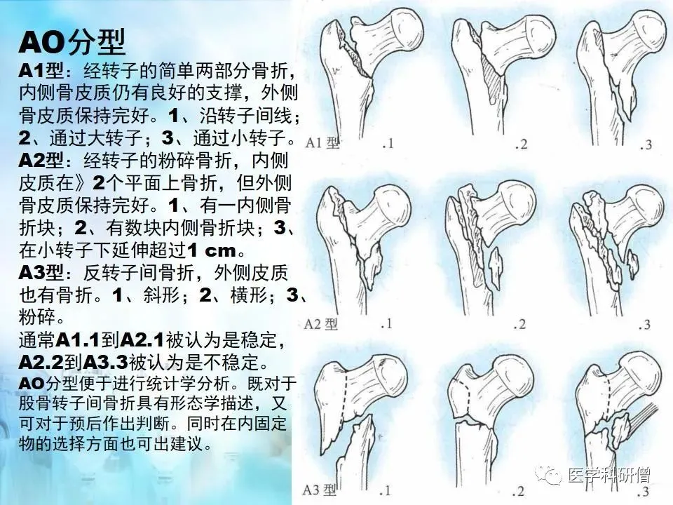 AO(Arbeitsgemeinschaft für Osteosynthesefragen)分型是一种全面而系统的骨折分型方法,广泛应用于各种骨折的分类和预后判断。在股骨转子间骨折中,AO分型根据骨折线的位置、形态、移位程度以及是否涉及关节面等因素,将转子间骨折分为多个类型,每个类型下又包含若干亚型,形成了一套完整的分型体系。
