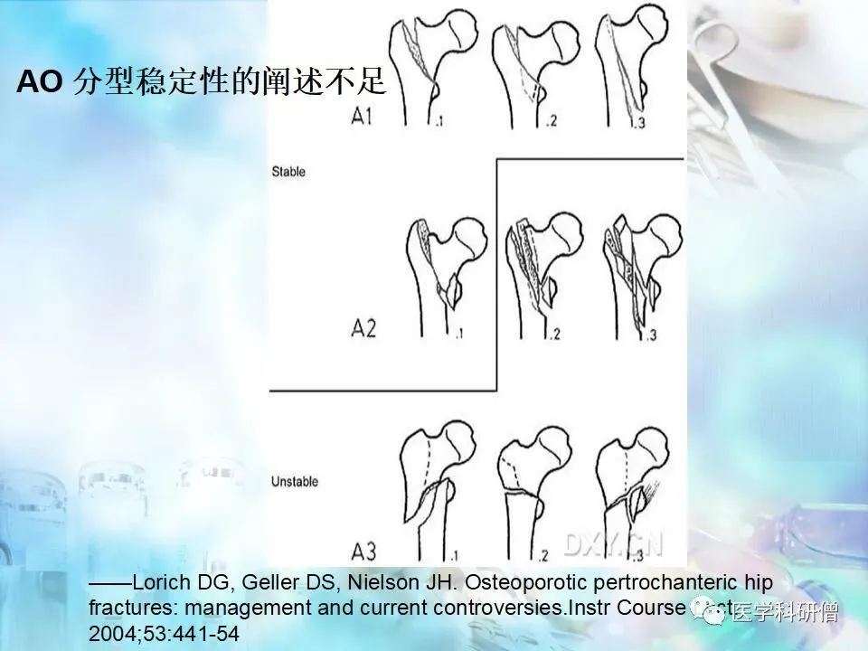 目前,关于股骨转子间骨折的分型系统有多种,如Evans分型、AO分型、Jensen分型等。每种分型系统都有其独特的分类标准和临床应用价值,但也存在一定的局限性和争议。